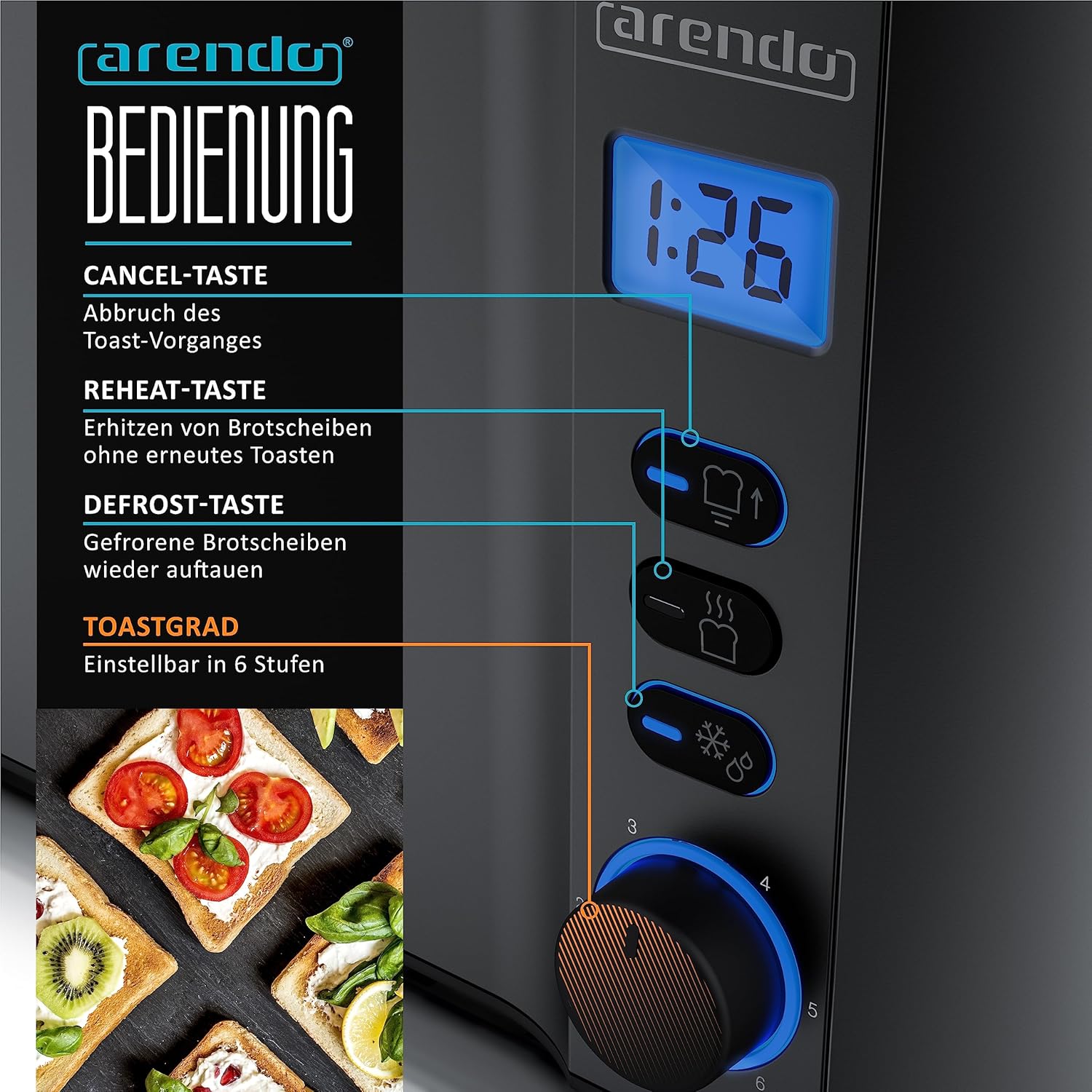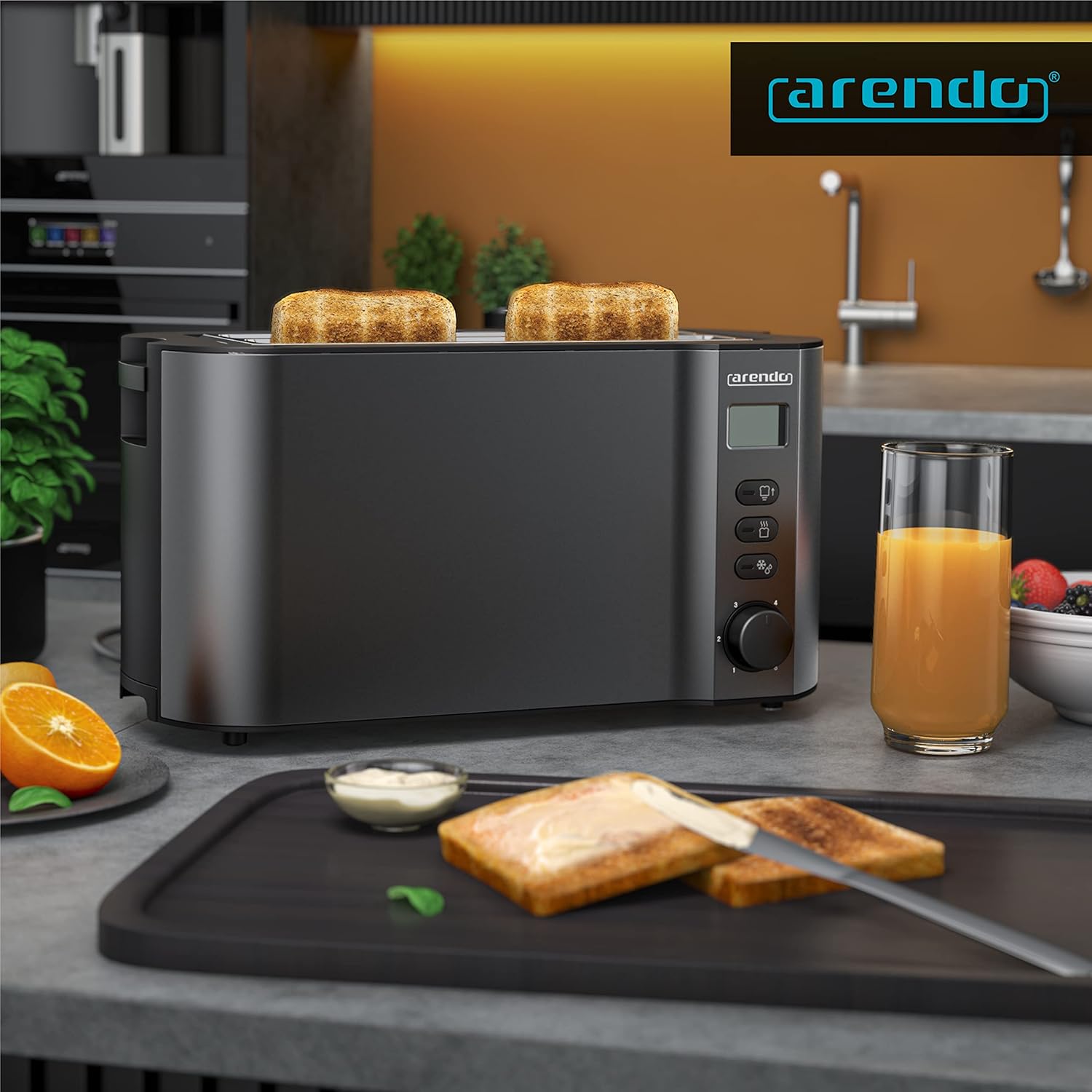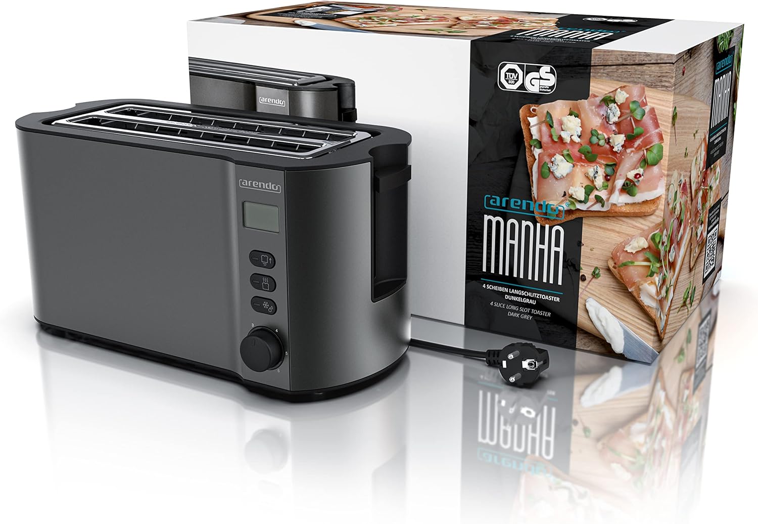 The Arendo MANHA 4-slice stainless steel long slot toaster. With display and integrated bread roll holder for the perfect family breakfast
