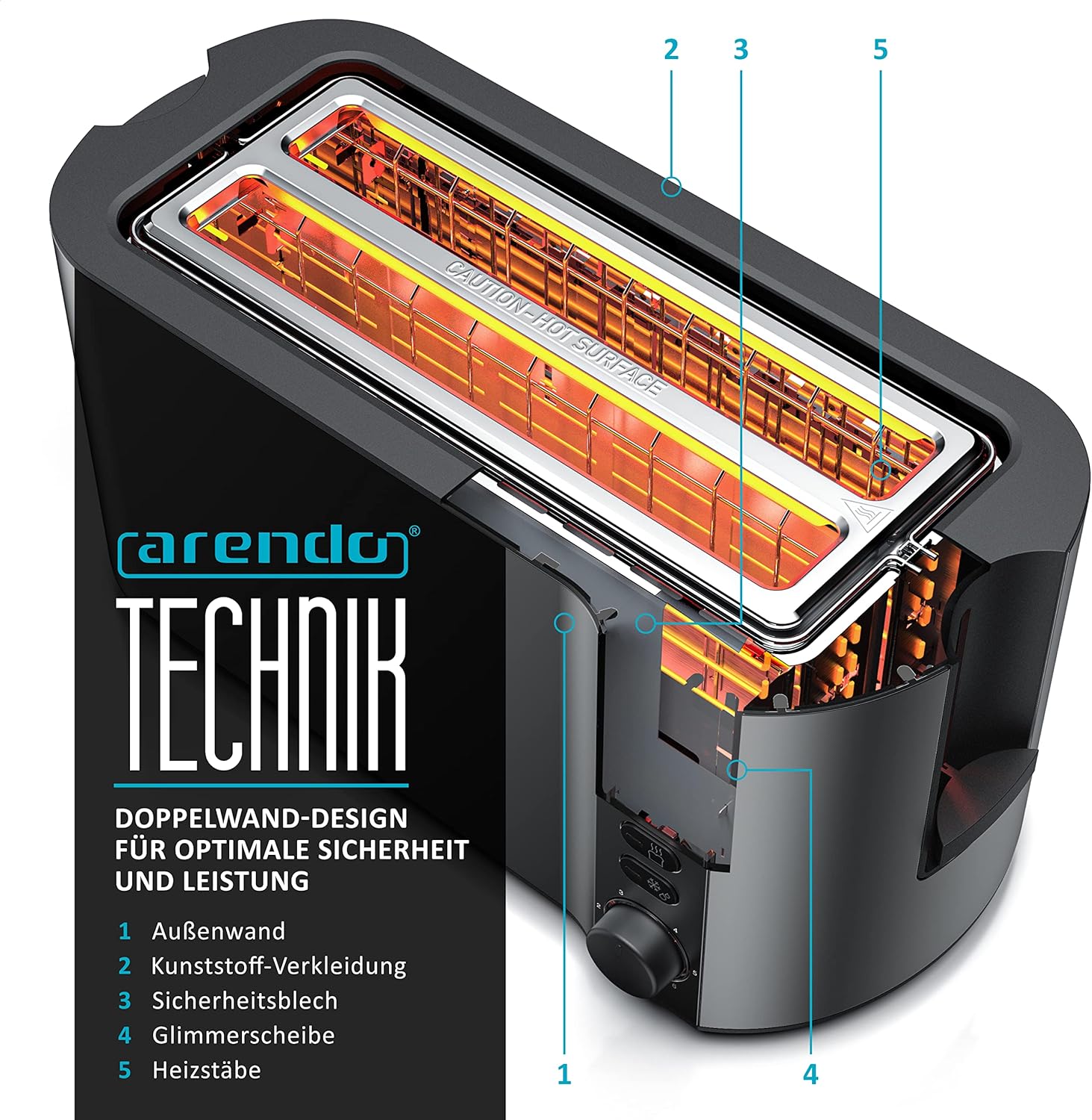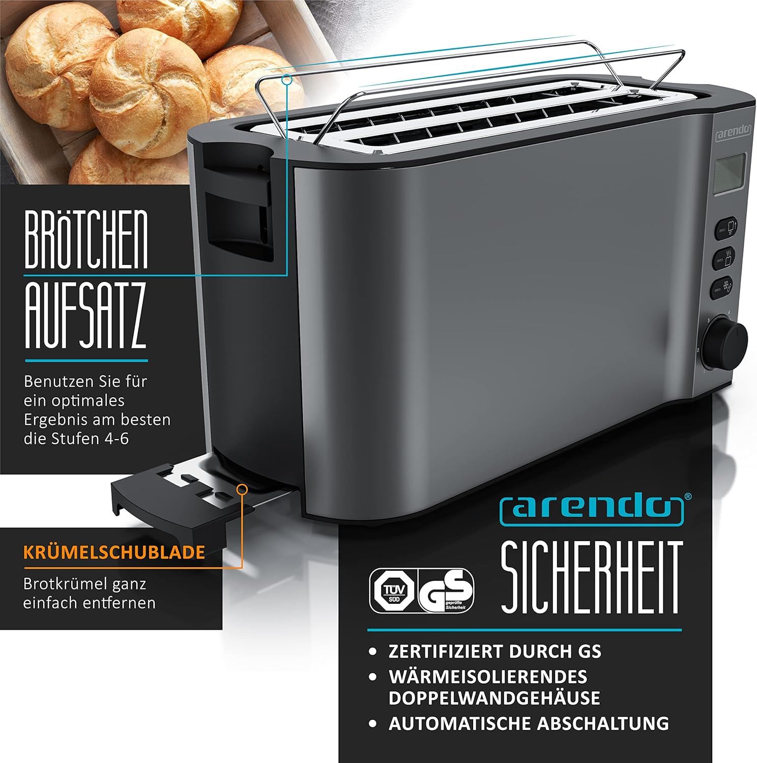 Some devices focus on a robust design, others are based on operating technology. The Arendo Manha combines both strengths. In its construction, emphasis was placed on the use of as much stainless steel as possible instead of plastic. The heat-insulating double wall housing is particularly stable. Another highlight is the display with easy-to-read LCD display of the remaining time and the selected browning level (6 settings possible). With the integrated bun holder, you can also toast baguettes, rolls and croissants delicious crispy.