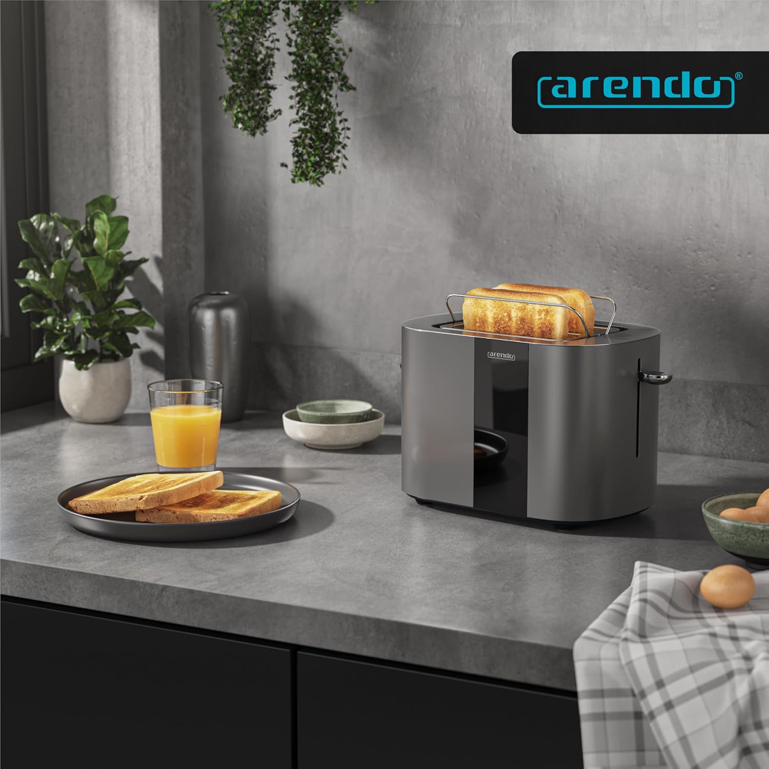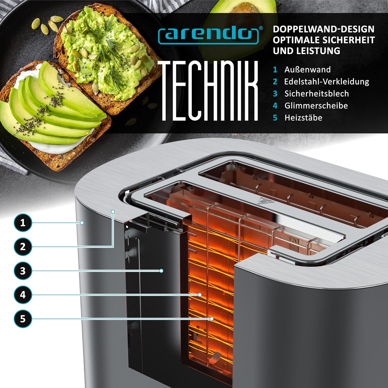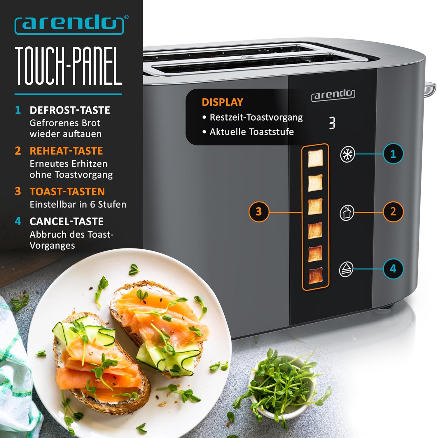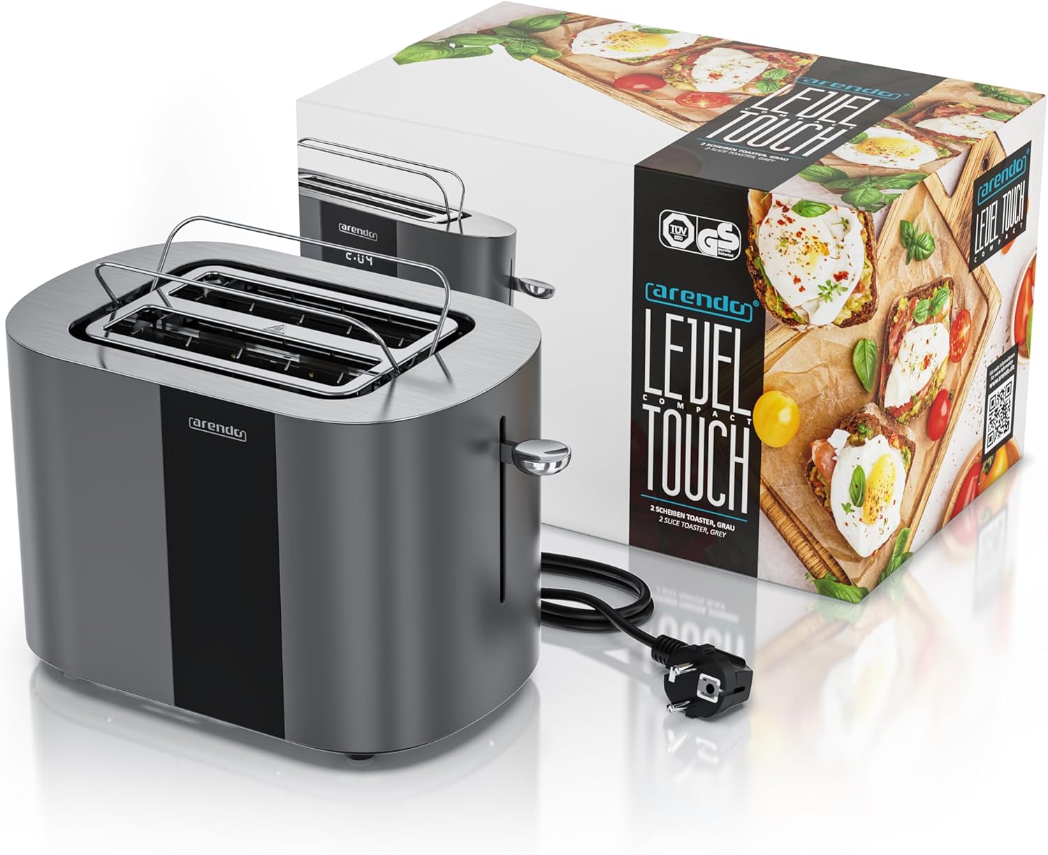 • ИНОВАЦИЯТА ОТ СПЕЦИАЛИСТА ПО ТОСТЕРИ ARENDO. Изживейте комфортно приготвяне на препечен хляб с модерна технология и атрактивно цветово представяне: 6-те икони за препечен хляб с илюстрация на степените на препичане позволяват прецизен предварителен избор - от леко покафенял до изключително хрупкав. На практичния LED дисплей с таймер за обратно броене можете да видите по всяко време кога вашият препечен хляб е готов за изпичане. GS - тествана безопасност | 307193