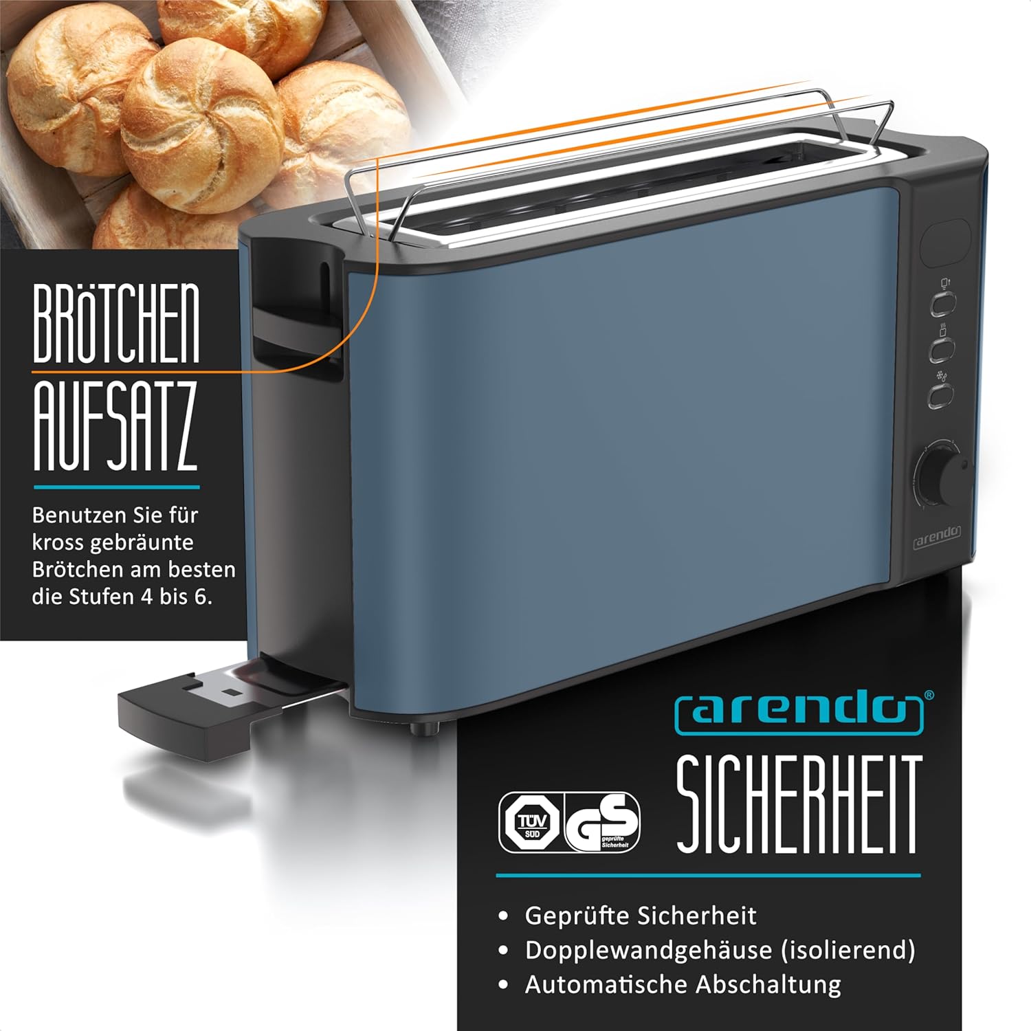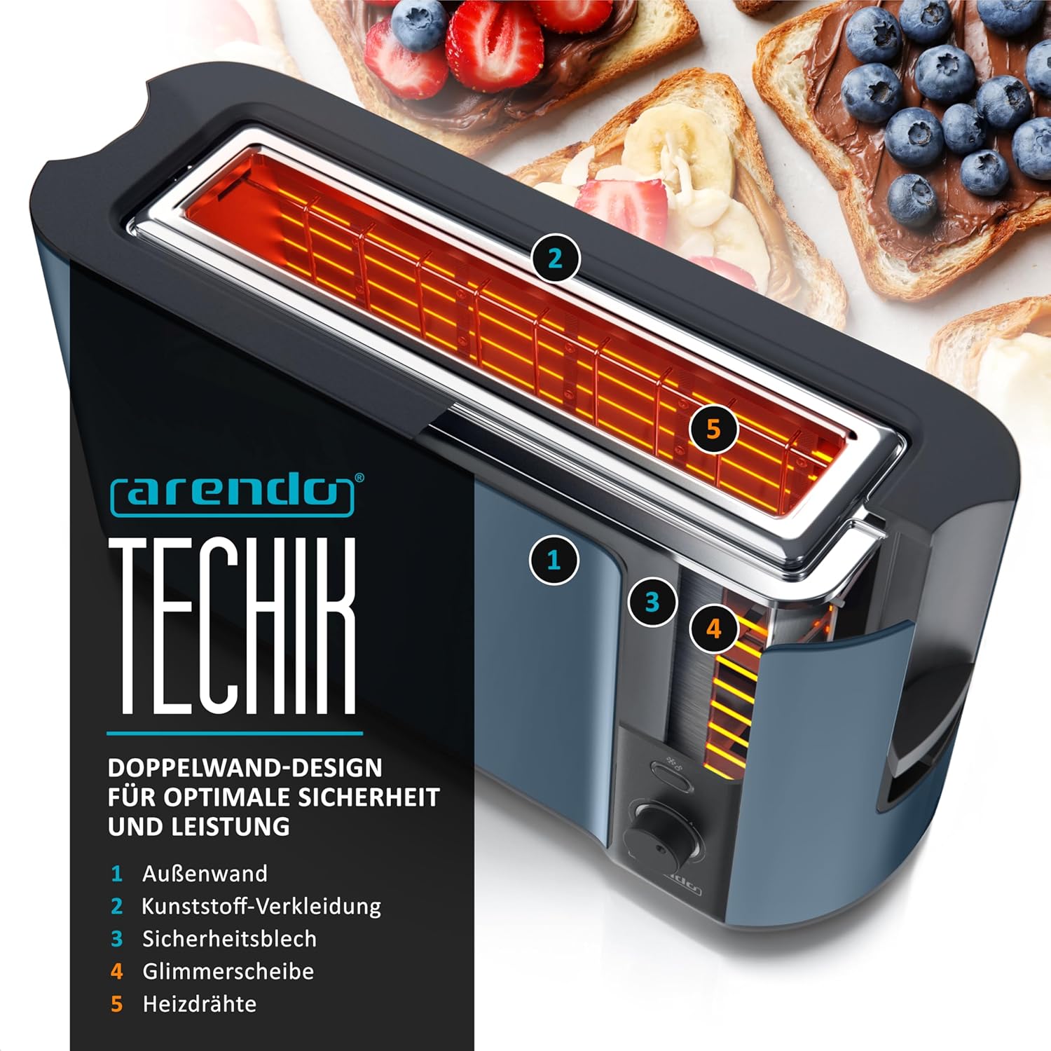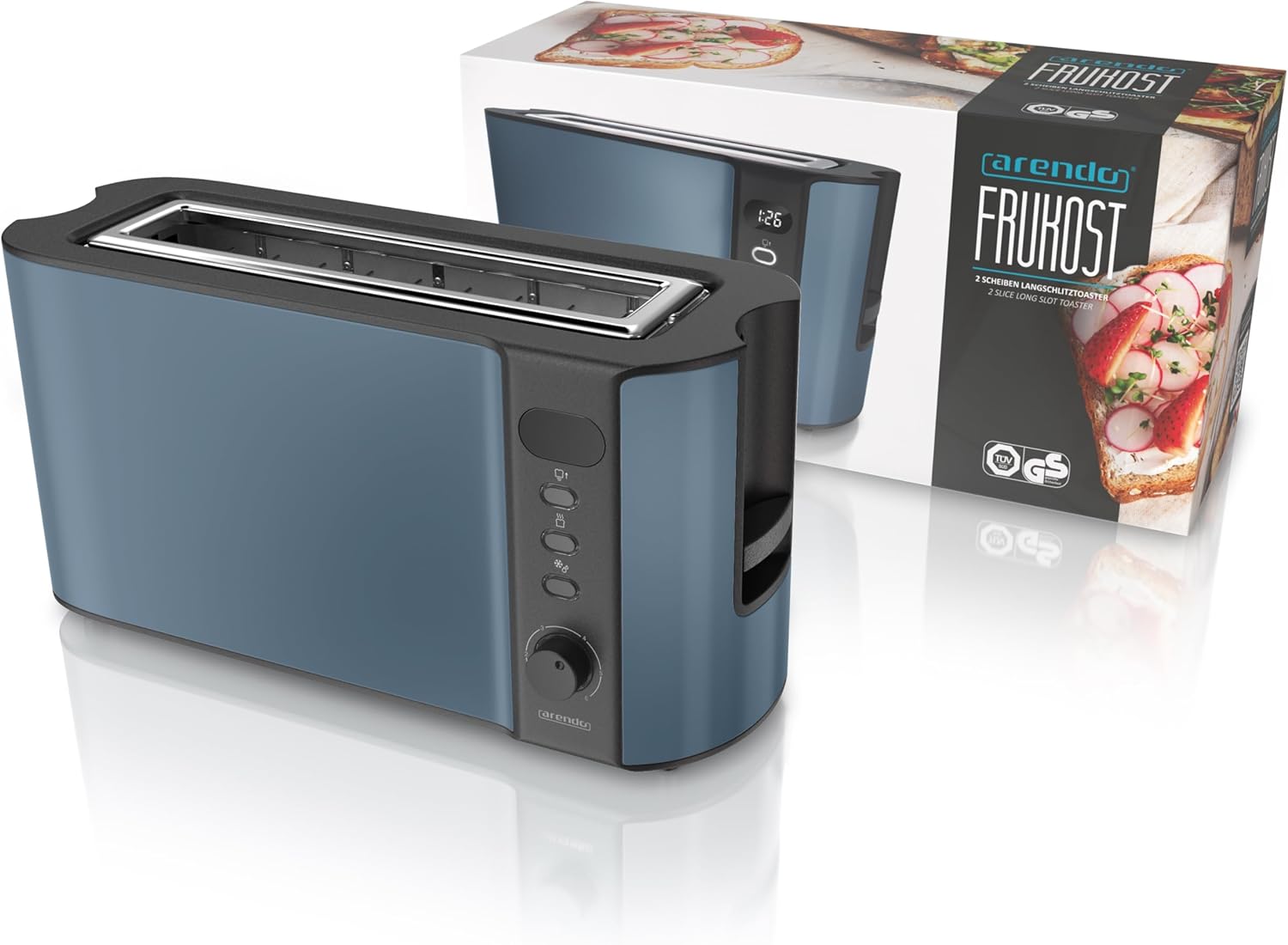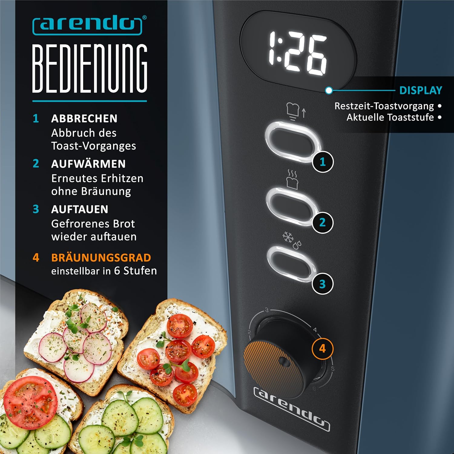 Arendo - Тостер с дълъг отвор за 2 филийки - Функция за размразяване - 1000 W - Корпус с двойни стени - Вградена приставка за хлебчета - Степен на изпичане 1-6 - Дисплей с показване на оставащото време - Неръждаема стомана Admiral