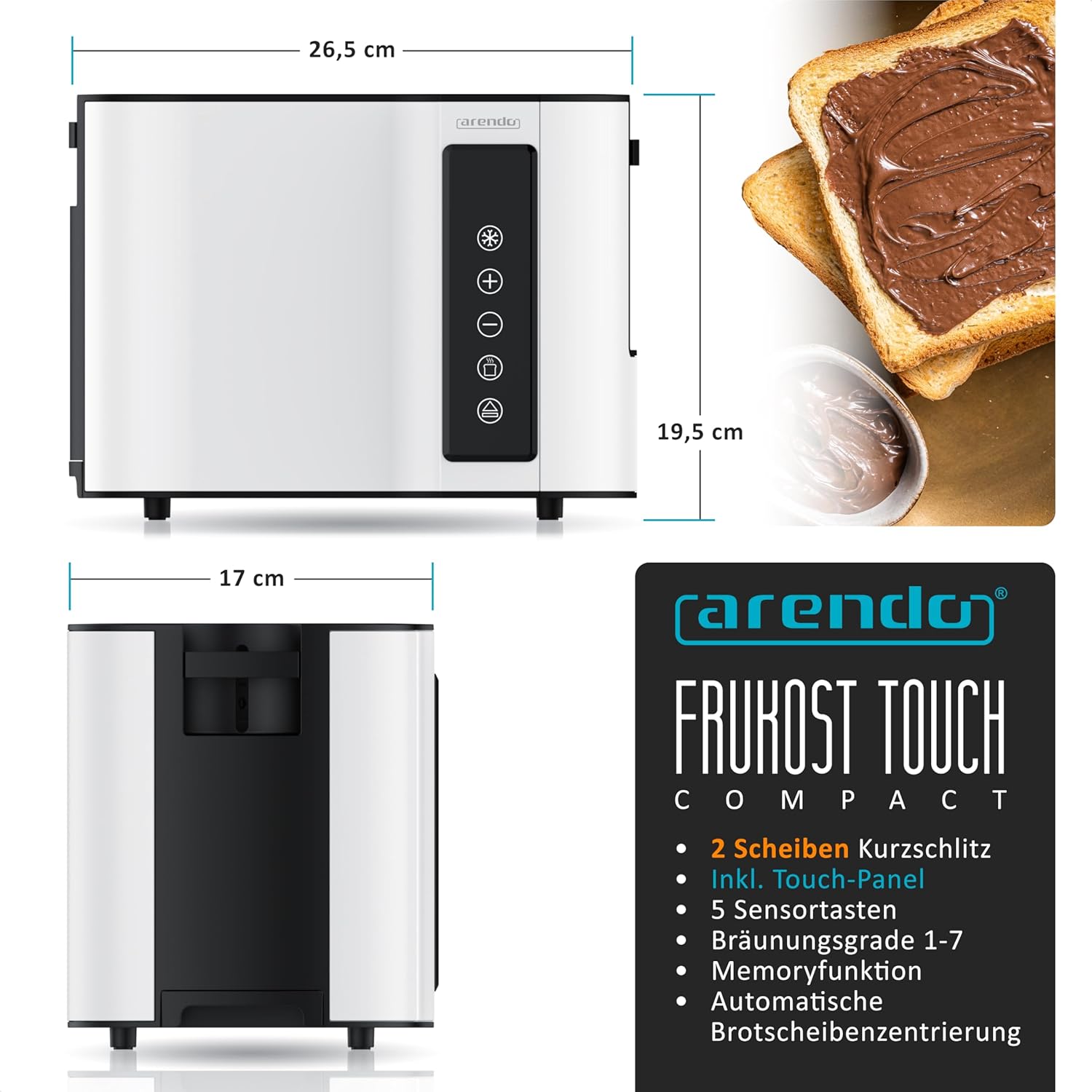 • Размери (без приставката за хлебче): дължина 26,5 см x височина 19,5 см x ширина 17 см, дължина на захранващия кабел: 90 см, тегло: 1530 г, материал: пластмаса и неръждаема стомана с матирана повърхност, съдържание на кутията: Arendo тостер за 2 филии Frukost Touch Compact + ръководство за употреба (английски език не е гарантиран)