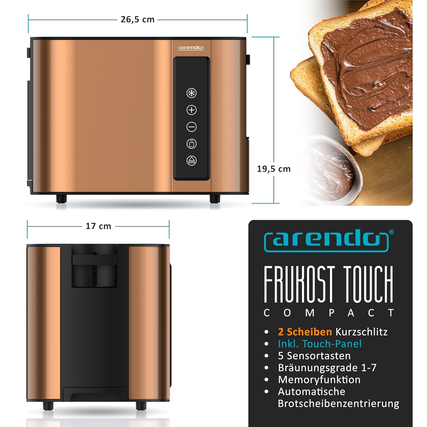 • Размери (без приставката за хлебче): дължина 26,5 см x височина 19,5 см x ширина 17 см, дължина на захранващия кабел: 90 см, тегло: 1530 г, материал: пластмаса и неръждаема стомана с матирана повърхност, съдържание на кутията: Arendo тостер за 2 филии Frukost Touch Compact + ръководство за употреба (английски език не е гарантиран)