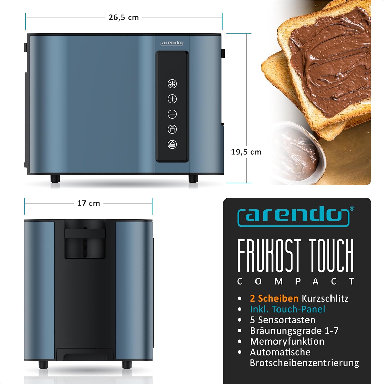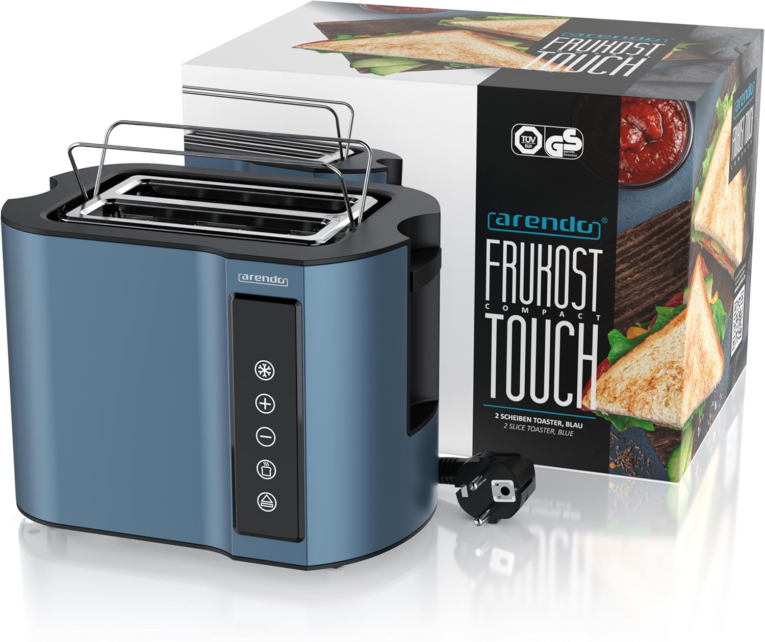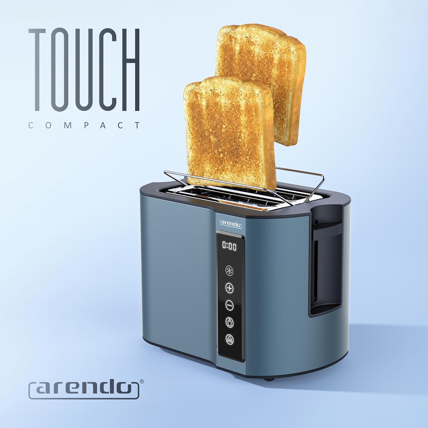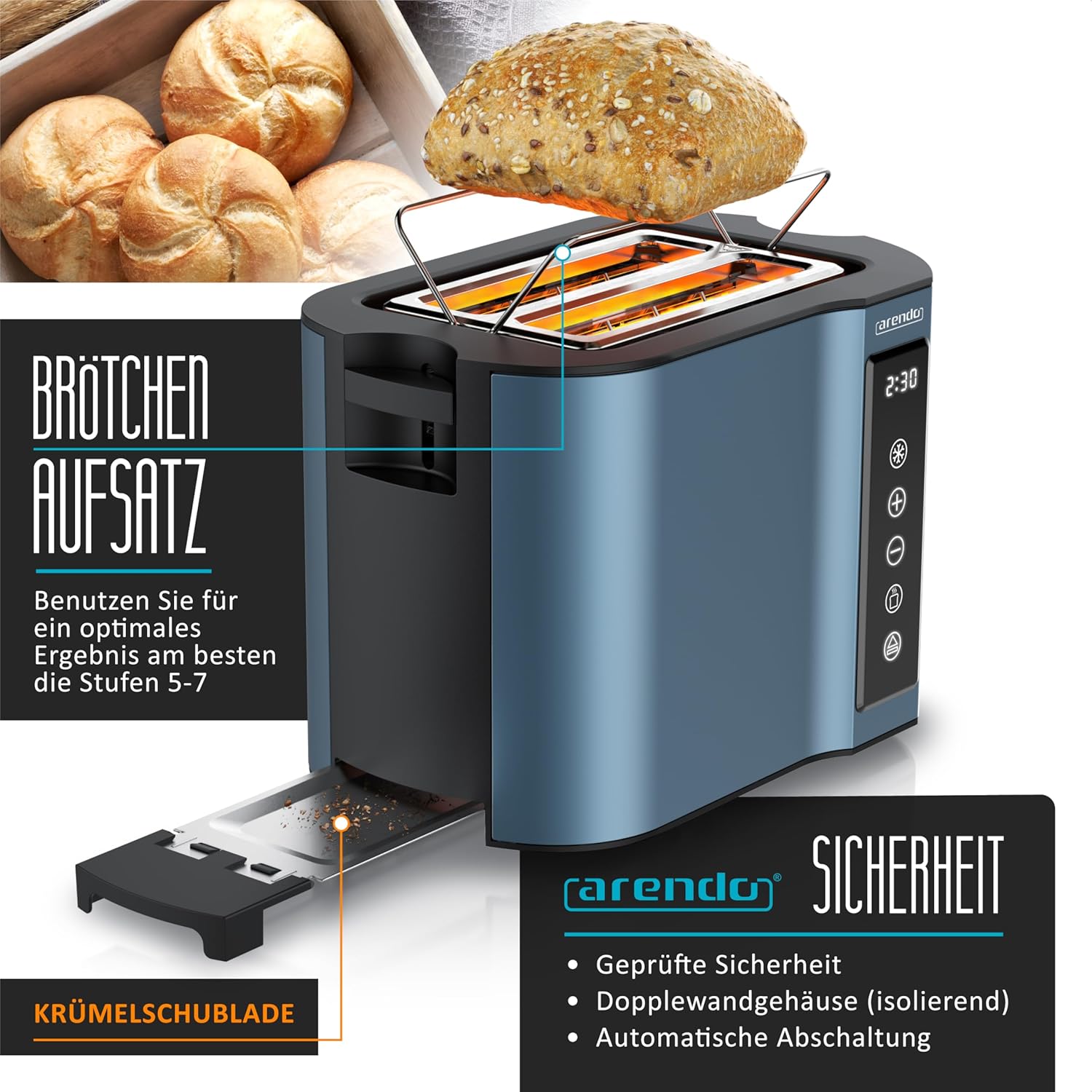 Arendo - Тостер за 2 филии, неръждаема стомана, сензорен панел, дигитален дисплей, дисплей за оставащо време, 800 W, корпус с двойни стени, с приставка за хлебче, 7 нива на изпичане, нарязване на хляб, син