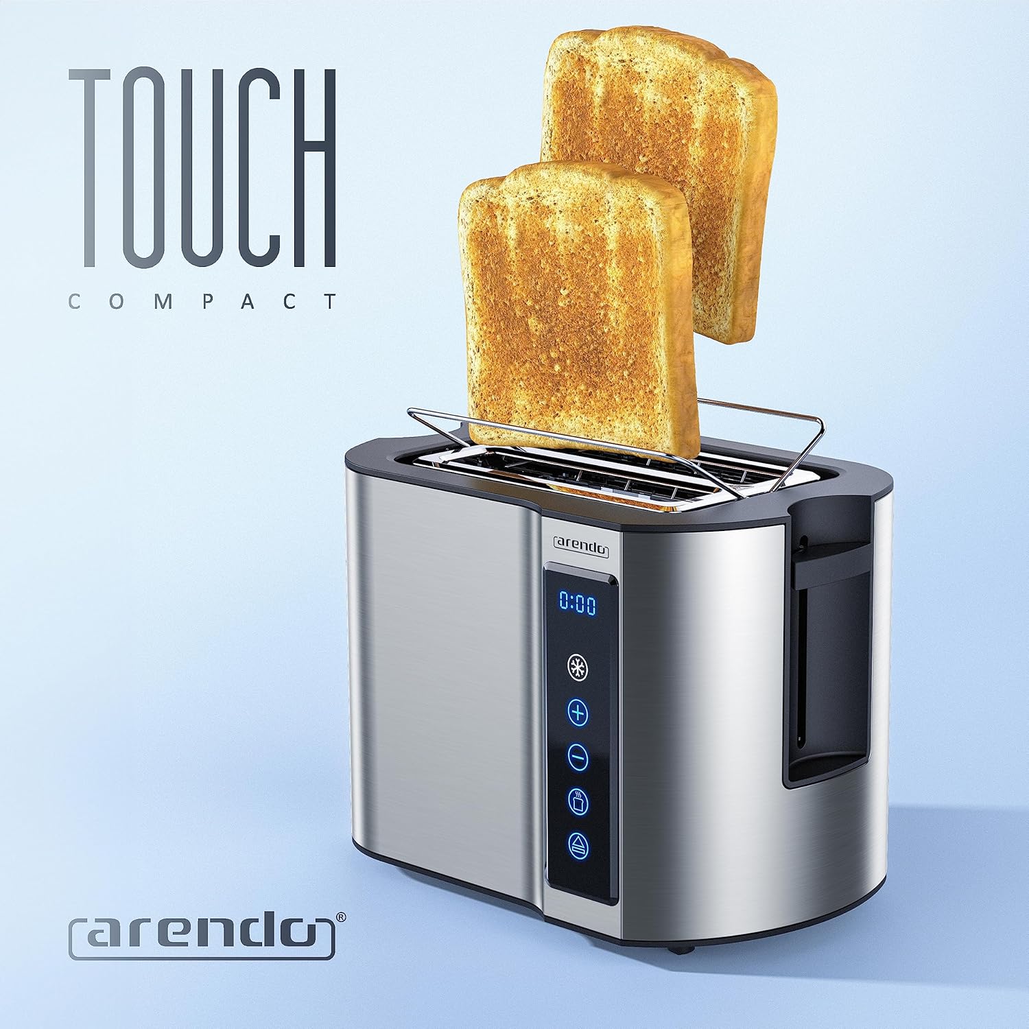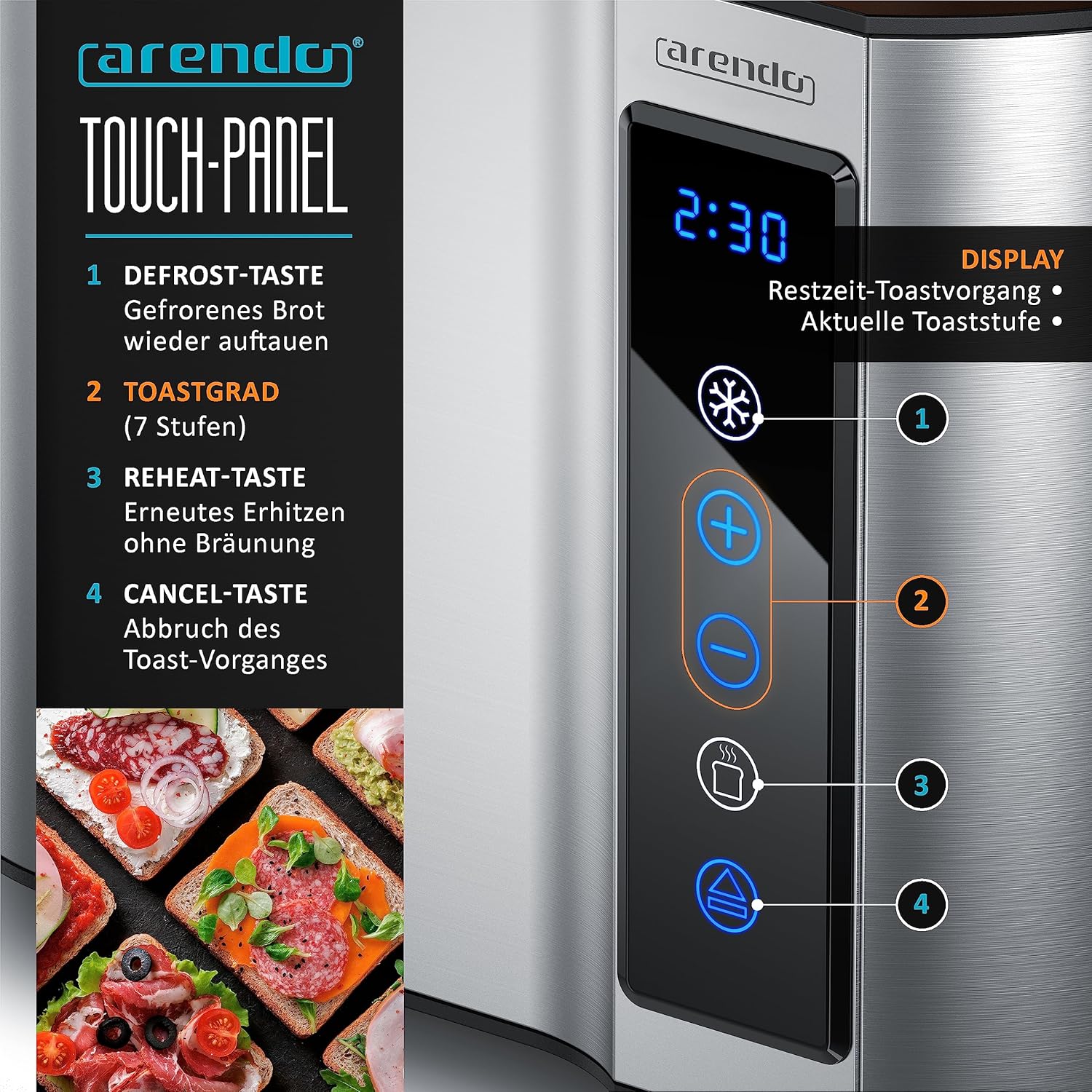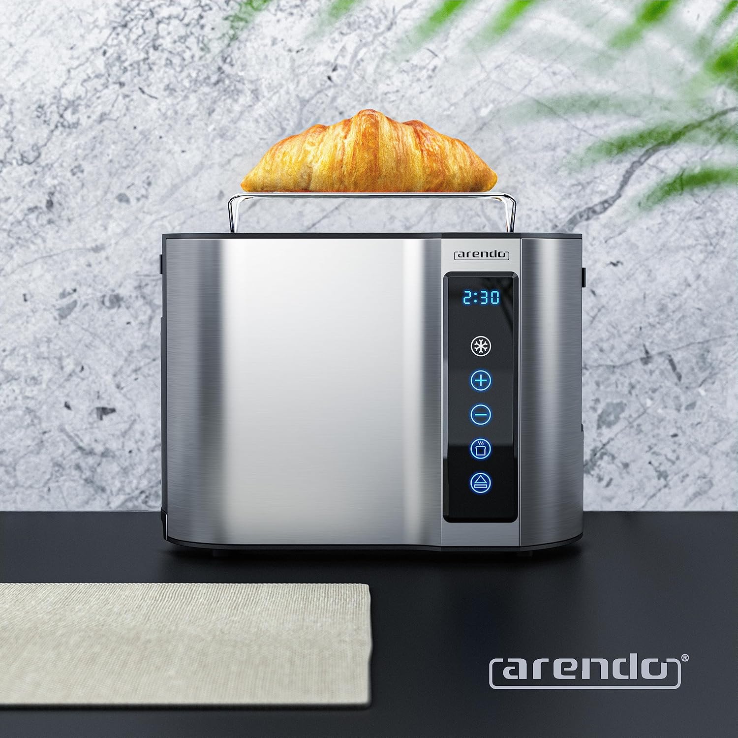 Arendo - Тостер за 2 филии, неръждаема стомана, сензорен панел, дигитален дисплей, дисплей за оставащо време, 800 W, корпус с двойни стени, с приставка за хлебче, 7 нива на изпичане, нарязване на хляб, сребрист
