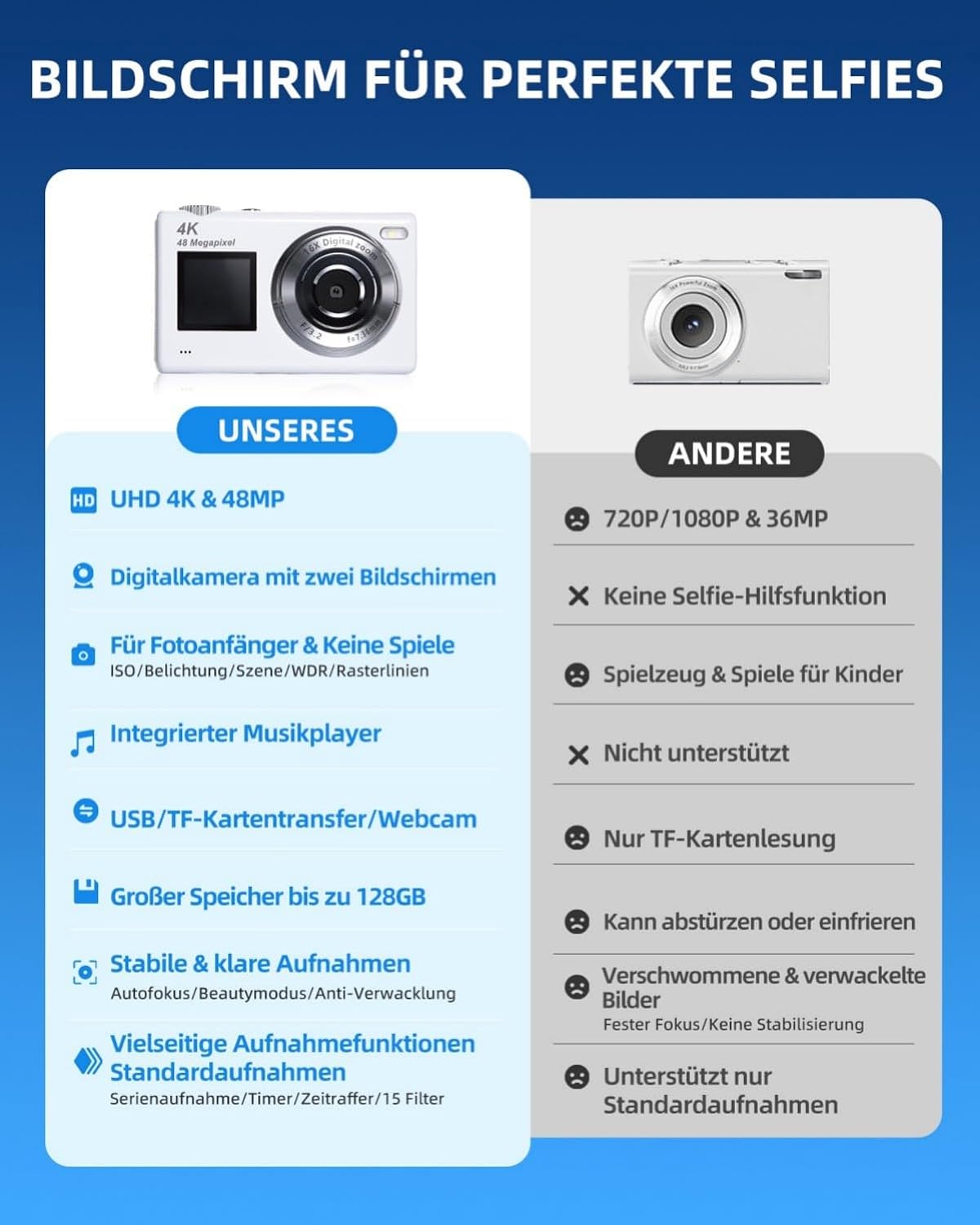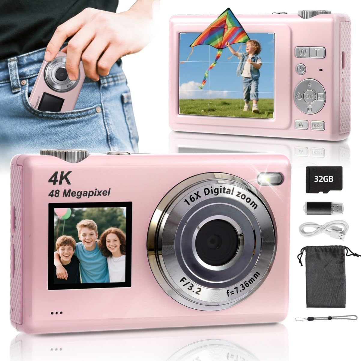 ARNSSIEN Цифров фотоапарат с двоен екран, автофокус 4K 48MP Влог камера с 32GB карта, компактен фотоапарат, 16X увеличение, Anti-Shake, подарък за деца, тийнейджъри, начинаещи, Y5