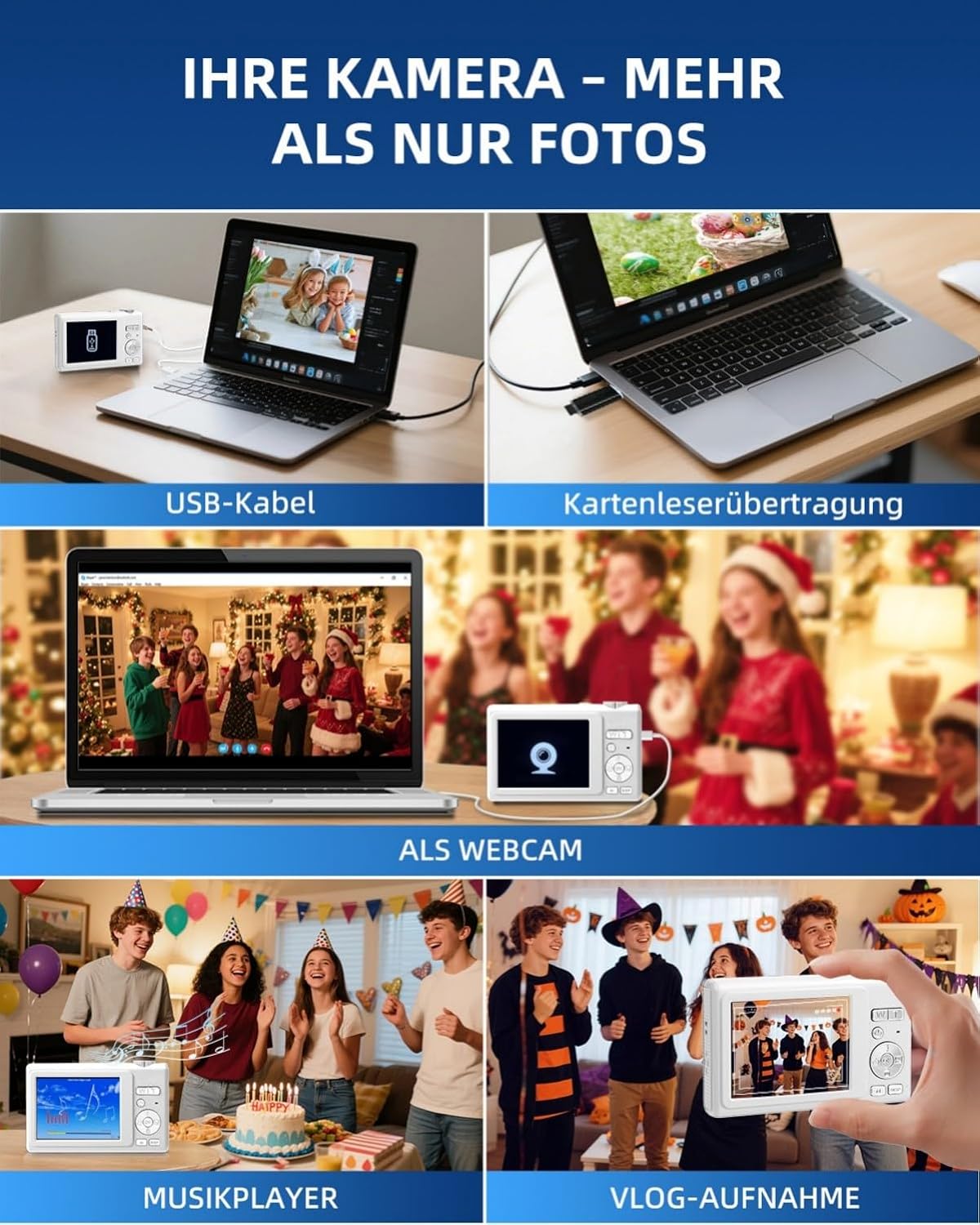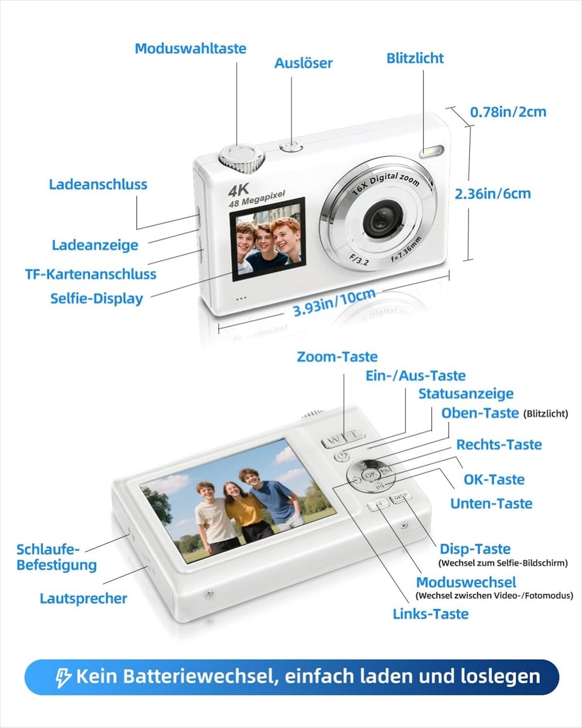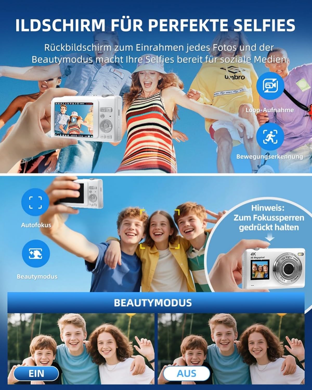 • Стабилизация на изображението и ултракомпактен дизайн: интегрираната стабилизация против трептене позволява безпроблемно влогване от ръката ви. С каишката за носене, спонтанната фотография навсякъде е лесна. Компактен USB-C дизайн за зареждане, пренос на данни и функция за уеб камера. Поддържа 32GB карта памет (разширяема до 128GB) и възпроизвеждане на MP3. Чудесен за партита, излизания и пътувания - перфектният подарък за деца, тийнейджъри и начинаещи влогъри.