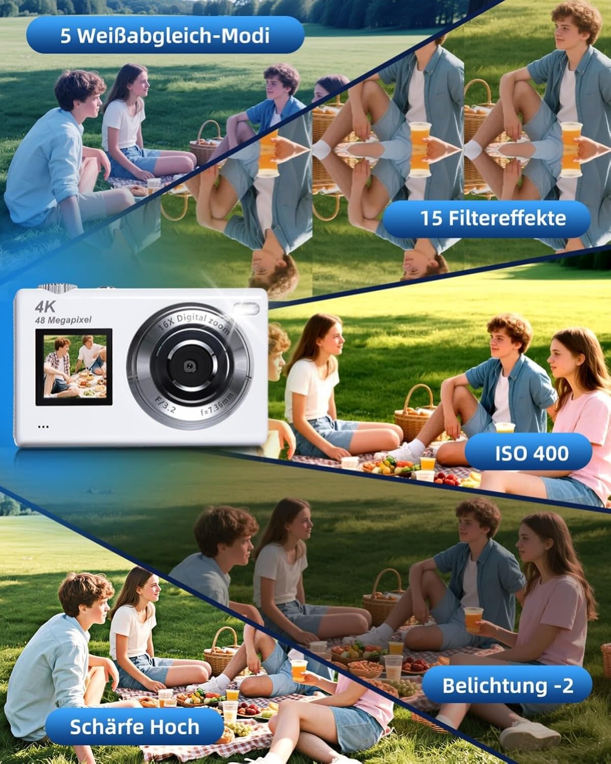 • 4K UHD & 48MP цифрова камера с двоен екран: Оборудвана с 2,8-инчов основен екран и 1,4-инчов дисплей за селфита с превключване с един бутон "DISP" - така че записите могат да се преглеждат в реално време, идеално за изключително ясни портрети. Заснема снимки с висока резолюция от 48MP (с автоматичен фокус чрез задържане), за да улови и най-фините детайли. 4K UHD видеоклиповете и 16x увеличението правят камерата идеална за пътуване, ежедневни моменти или влогове.