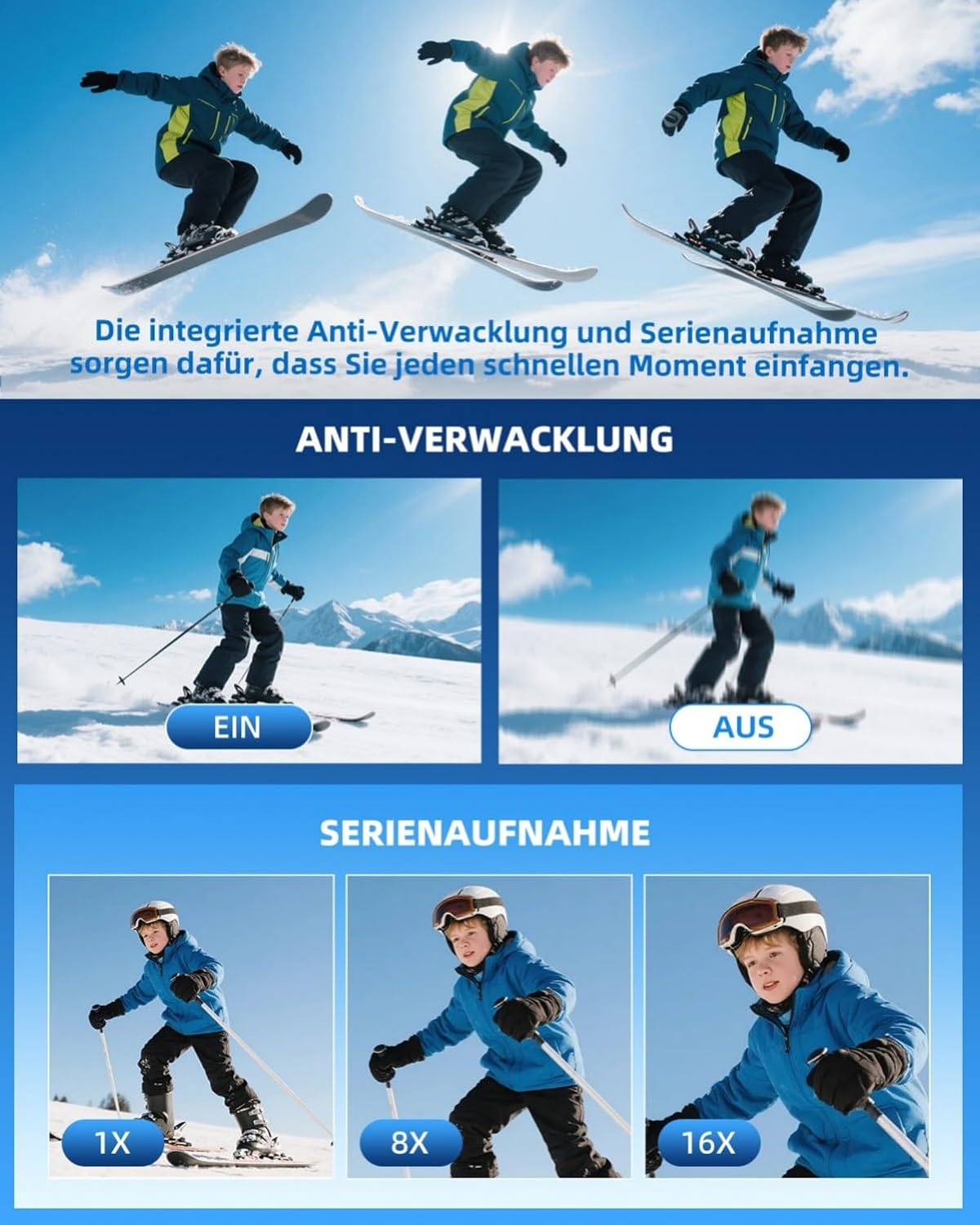 • Професионално симулирани циферблати и обширни настройки: фотоапарат за деца от начално ниво с циферблати, подобни на DSLR, за бързи настройки - децата овладяват основните функции за минути. Поддържа ISO, EV, баланс на бялото, WDR, светкавица, рязкост, както и 15 филтъра, режим за красота, серийно снимане, забавен каданс, ускорен кадър, стабилизация на изображението, разпознаване на движение и помощ при композицията. Така децата откриват света на професионалната фотография по игрив начин.