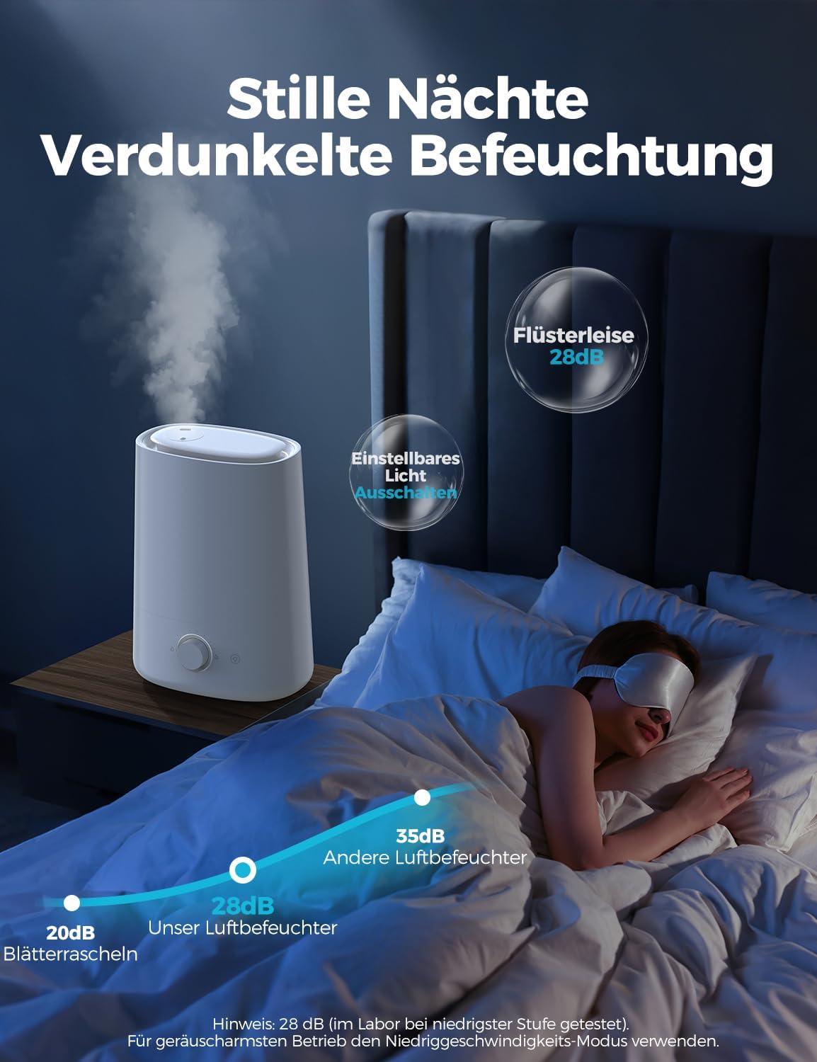 • Безгрижен сън благодарение на тиха и безопасна работа: Насладете се на успокояващ сън с почти безшумна работа и интелигентна безопасност. Само с 28 dB, този овлажнител за стая не нарушава съня на вашето бебе, нито вашия собствен. Функцията за автоматично изключване се активира, когато резервоарът е празен, осигурявайки ви пълно спокойствие.