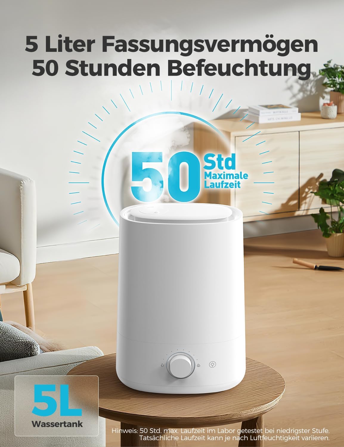 • 50-часова влажност за спокойни нощи: Насладете се на дълготрайно облекчение от сухия въздух. Този 5-литров овлажнител работи до 50 часа в нисък режим, което го прави идеален за средни и големи спални. Той работи цяла нощ, за да облекчи затрудненото дишане и да създаде идеална среда за дълбок, непрекъснат сън.