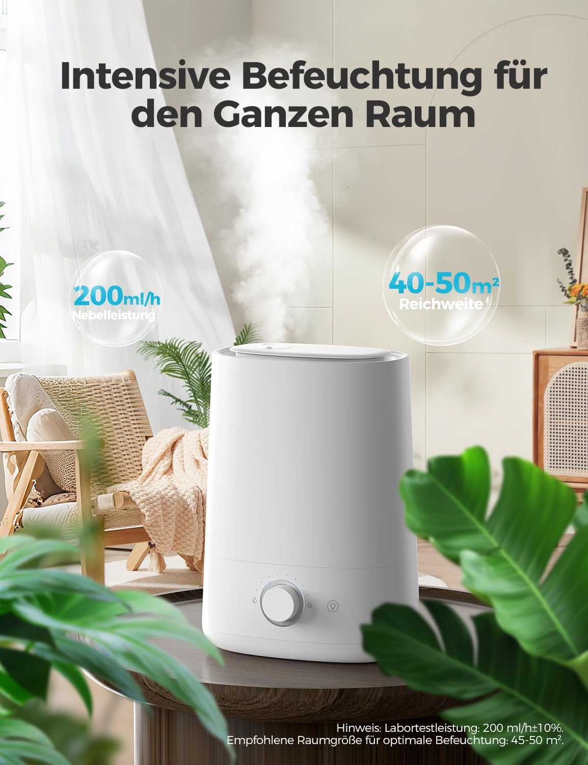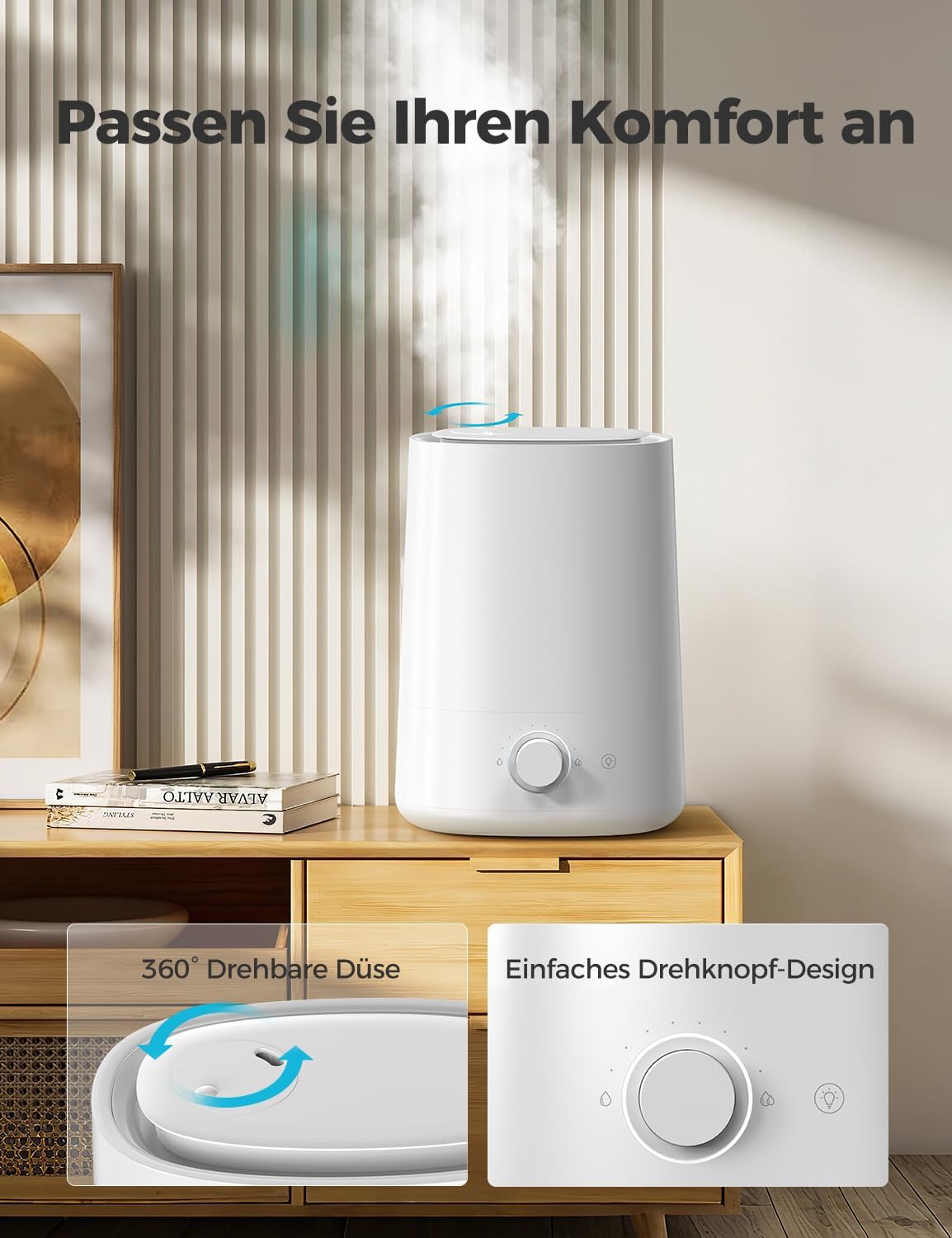 • Контролирайте мъглата и регулирайте интензитета без усилие: с нашия овлажнител имате контрол над вашето благополучие. Насочете въртящата се на 360° дюза, за да насочите влагата точно там, където искате, и регулирайте силата на мъглата с лесния за употреба бутон за перфектно персонализирано изживяване в стаята.