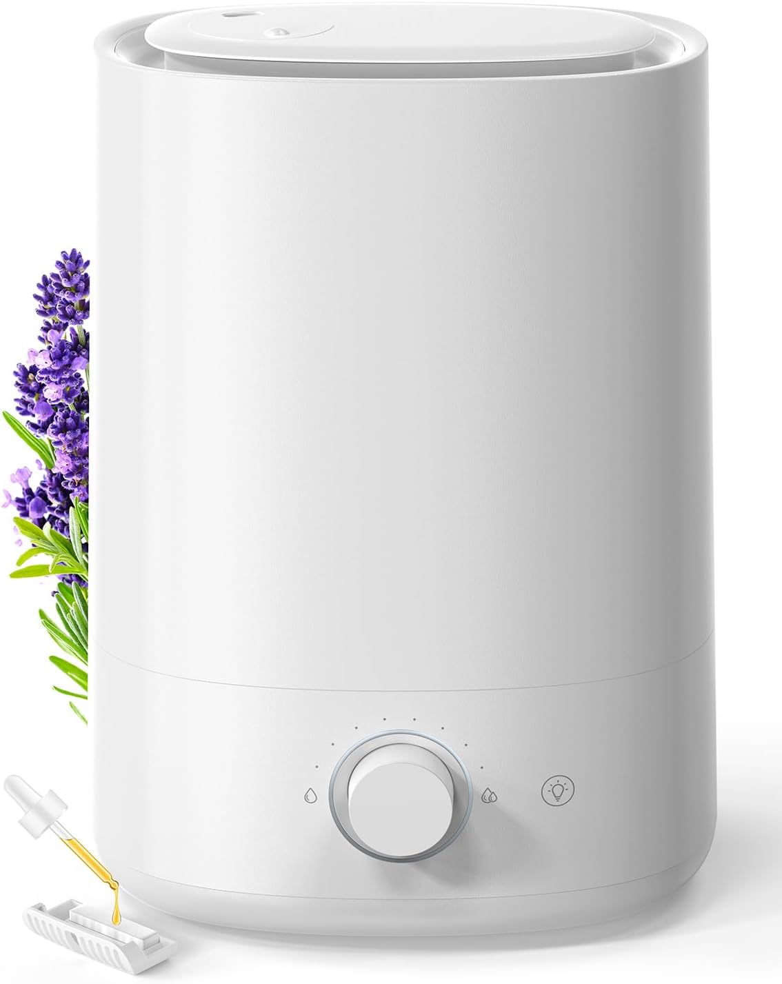 AROEVE 5L Овлажнител с горно пълнене, Ултразвуков овлажнител със студена мъгла за спалня с дифузер за етерични масла, въртяща се на 360° дюза, нощна светлина 28 dB, време на работа 50 часа, за бебешка стая, растения
