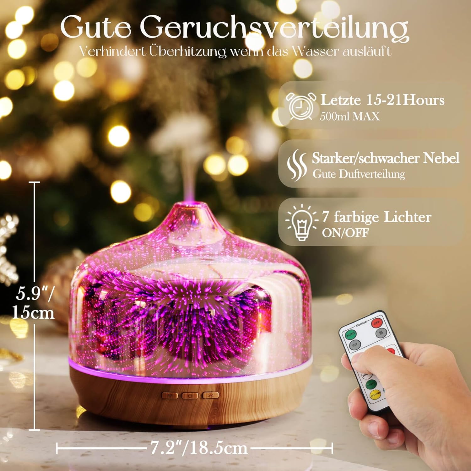 1. Remove the aroma diffuser from its packaging. 2. Fill water into the water tank. 3. Add 4-6 drops of essential oil (optional). 4. Close the lid. 5. Choose one of the 7 colours or the automatic colour changing mode. 6. Choose the mist mode: continuous spray or interval spray. 7. Turn on the diffuser. 8. For maintenance: rinse the water tank regularly with water and dry it thoroughly.