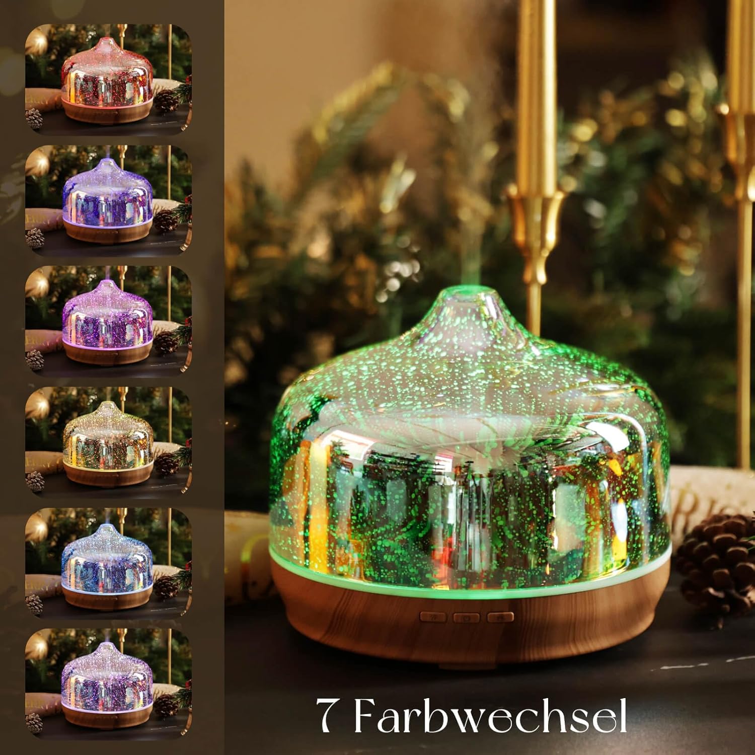 1. Remove the aroma diffuser from its packaging. 2. Fill water into the water tank. 3. Add 4-6 drops of essential oil (optional). 4. Close the lid. 5. Choose one of the 7 colours or the automatic colour changing mode. 6. Choose the mist mode: continuous spray or interval spray. 7. Turn on the diffuser. 8. For maintenance: rinse the water tank regularly with water and dry it thoroughly.