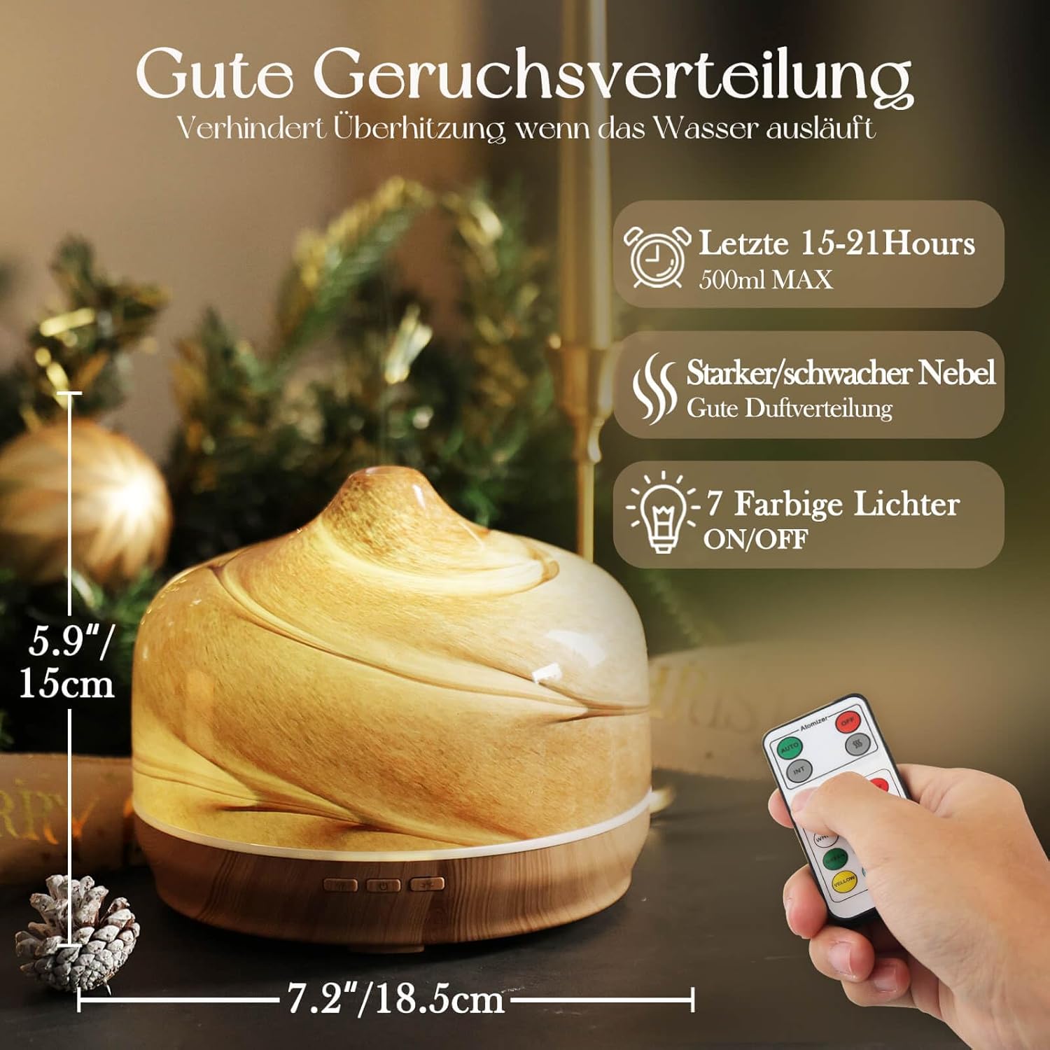 1. Remove the aroma diffuser from its packaging. 2. Fill water into the water tank. 3. Add 4-6 drops of essential oil (optional). 4. Close the lid. 5. Choose one of the 7 colours or the automatic colour changing mode. 6. Choose the mist mode: continuous spray or interval spray. 7. Turn on the diffuser. 8. For maintenance: rinse the water tank regularly with water and dry it thoroughly.
