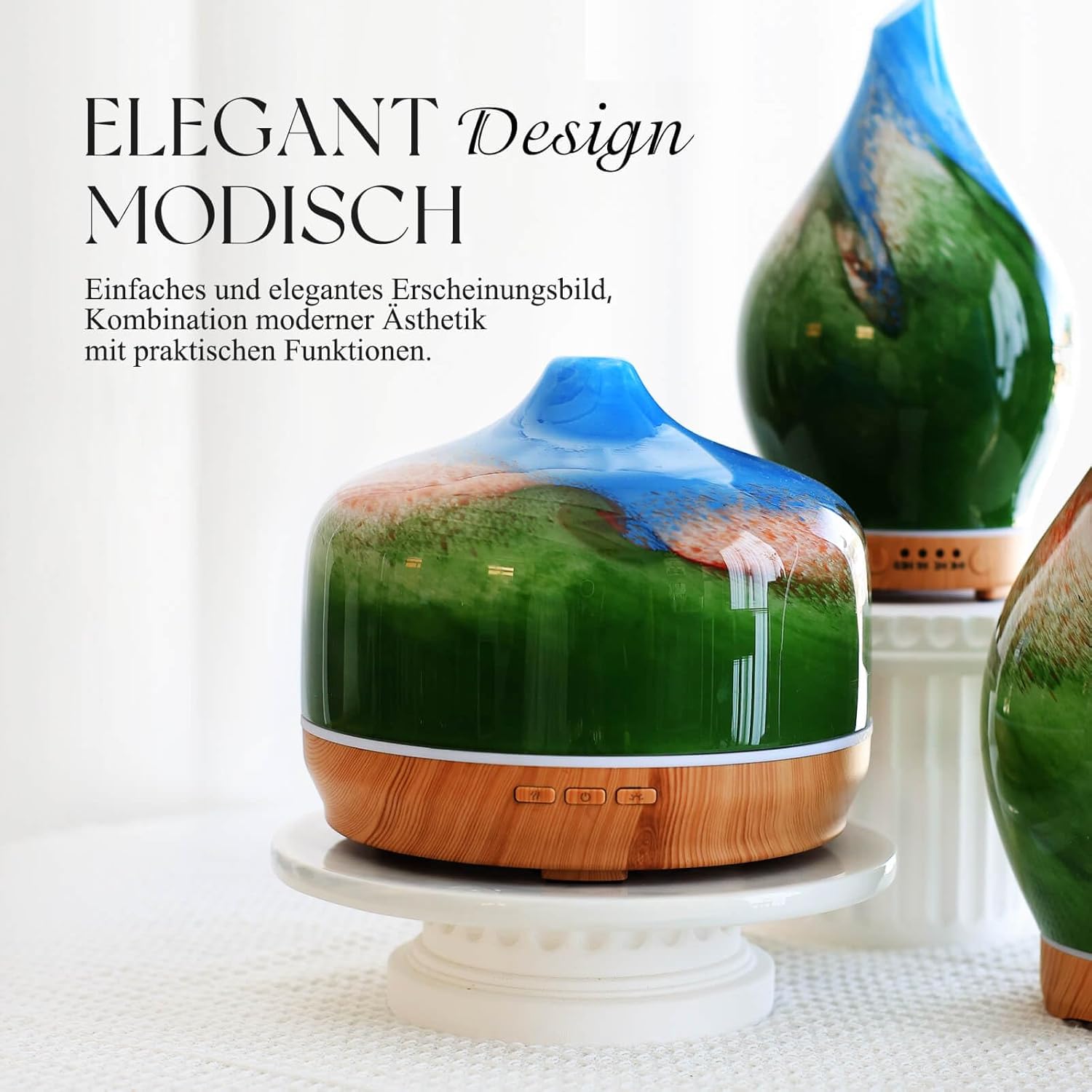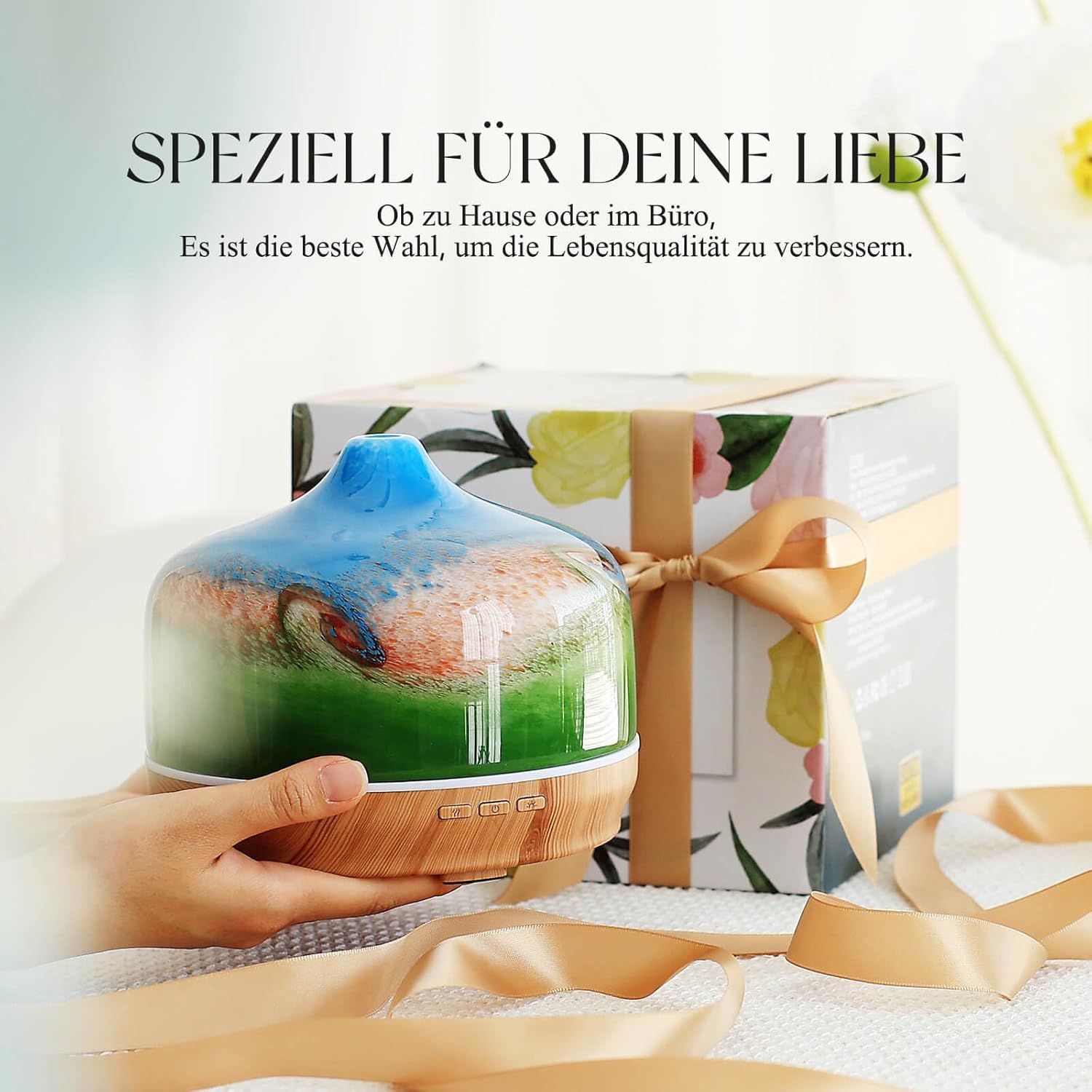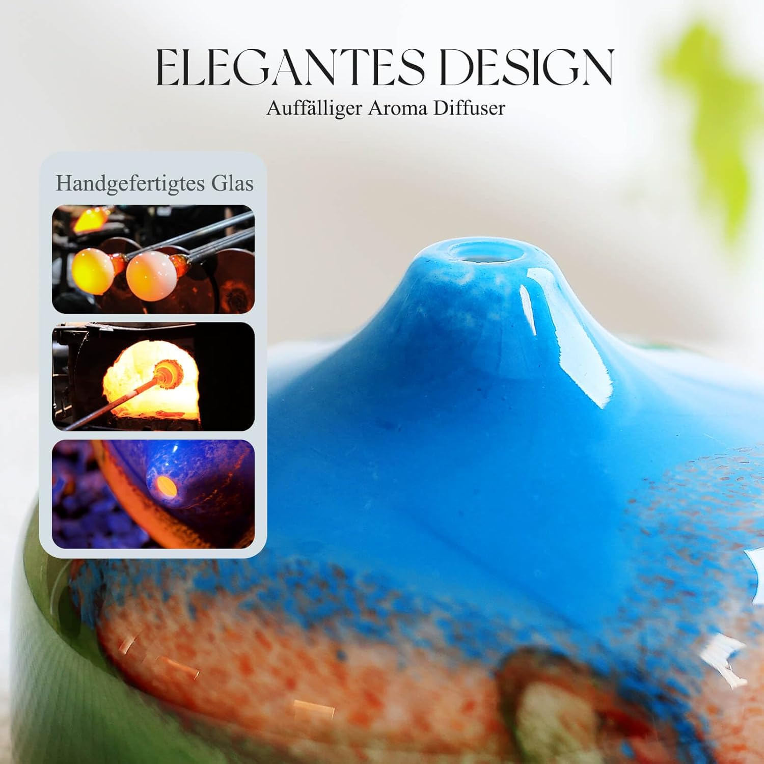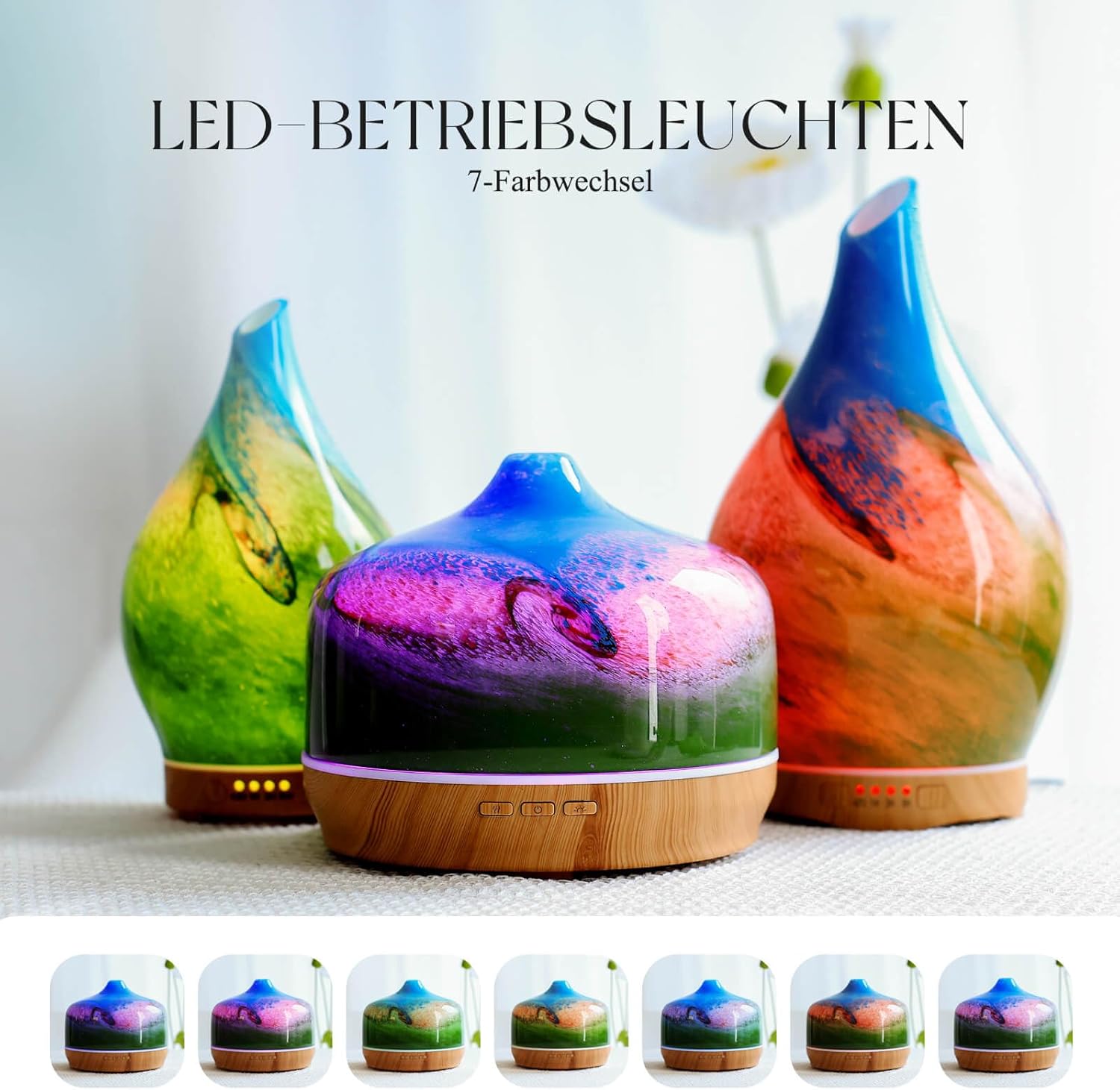 1. Remove the aroma diffuser from its packaging. 2. Fill water into the water tank. 3. Add 4-6 drops of essential oil (optional). 4. Close the lid. 5. Choose one of the 7 colours or the automatic colour changing mode. 6. Choose the mist mode: continuous spray or interval spray. 7. Turn on the diffuser. 8. For maintenance: rinse the water tank regularly with water and dry it thoroughly.