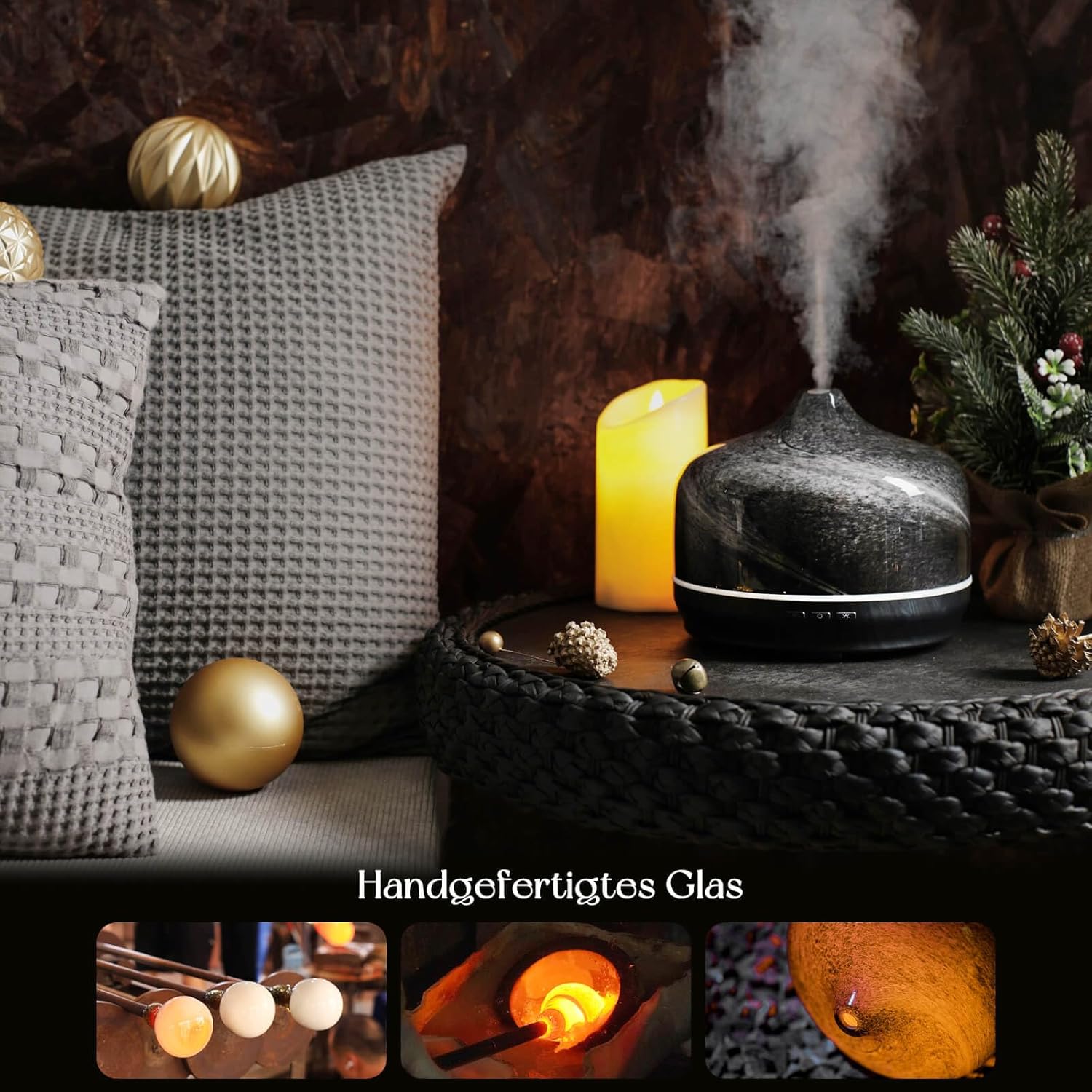 1. Remove the aroma diffuser from its packaging. 2. Fill water into the water tank. 3. Add 4-6 drops of essential oil (optional). 4. Close the lid. 5. Choose one of the 7 colours or the automatic colour changing mode. 6. Choose the mist mode: continuous spray or interval spray. 7. Turn on the diffuser. 8. For maintenance: rinse the water tank regularly with water and dry it thoroughly.