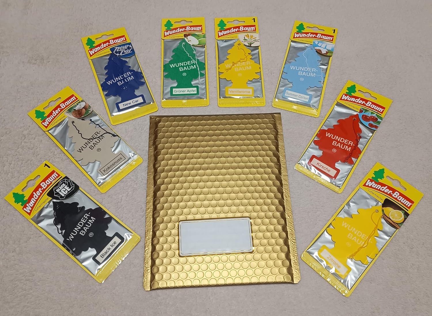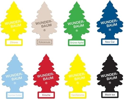 Ще получите осем различни освежителя за въздух марка "Wunder-Baum" в подаръчна кутия. Подаръчната кутия има място за писане на съобщение, идеално за да зарадвате любимите си хора. Включена е и кутия за доставка с етикет за адрес, ако желаете да изпратите подаръка и други артикули. Аромати: по един на Черен лед, Зелена ябълка, Череша, Кокос, Нова кола, Летен памук, Ванилия и Лимон.