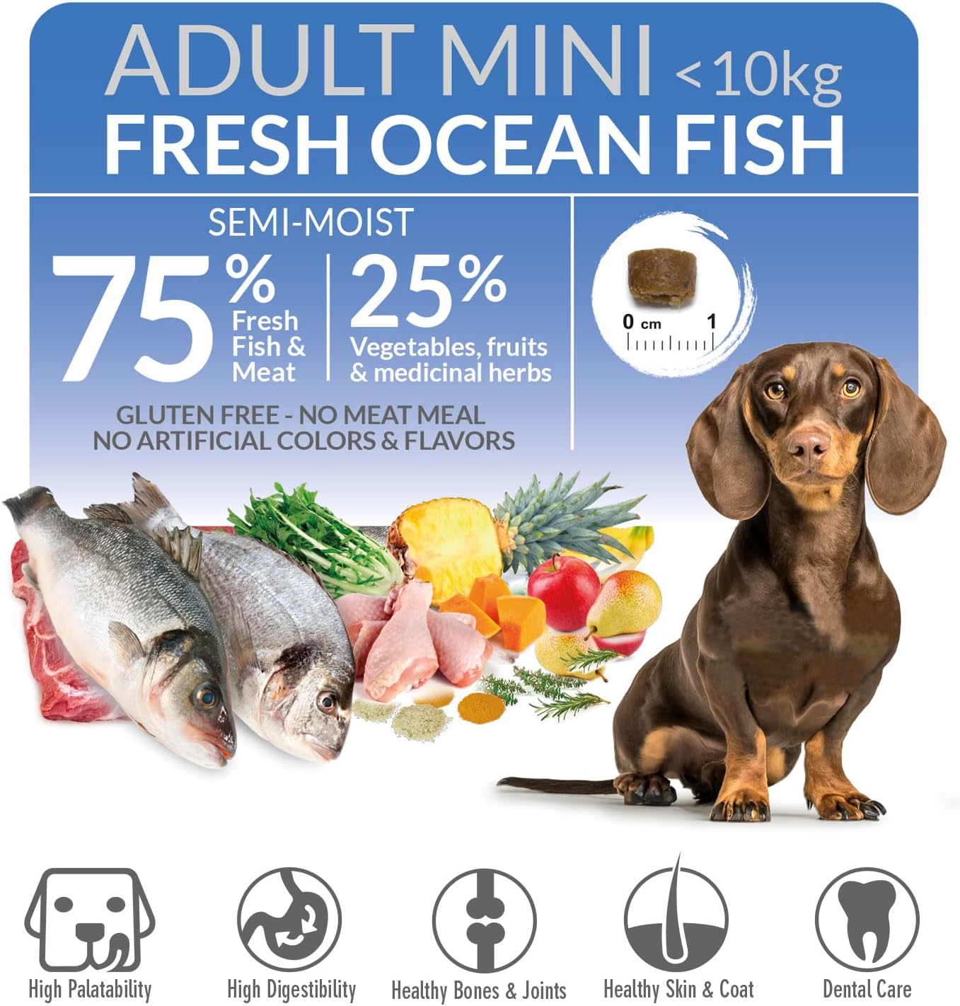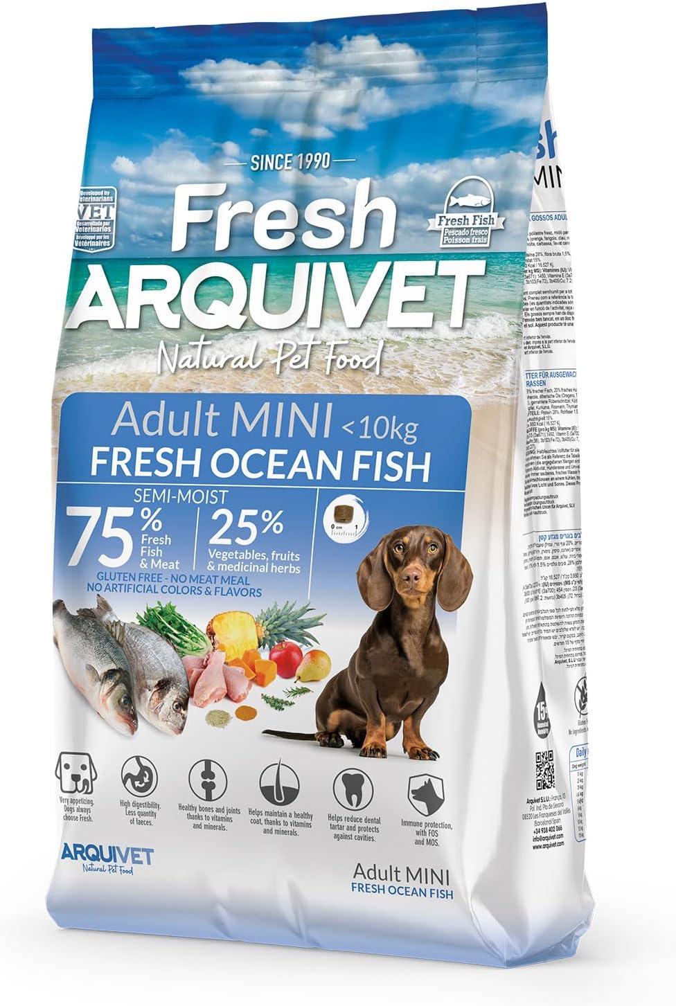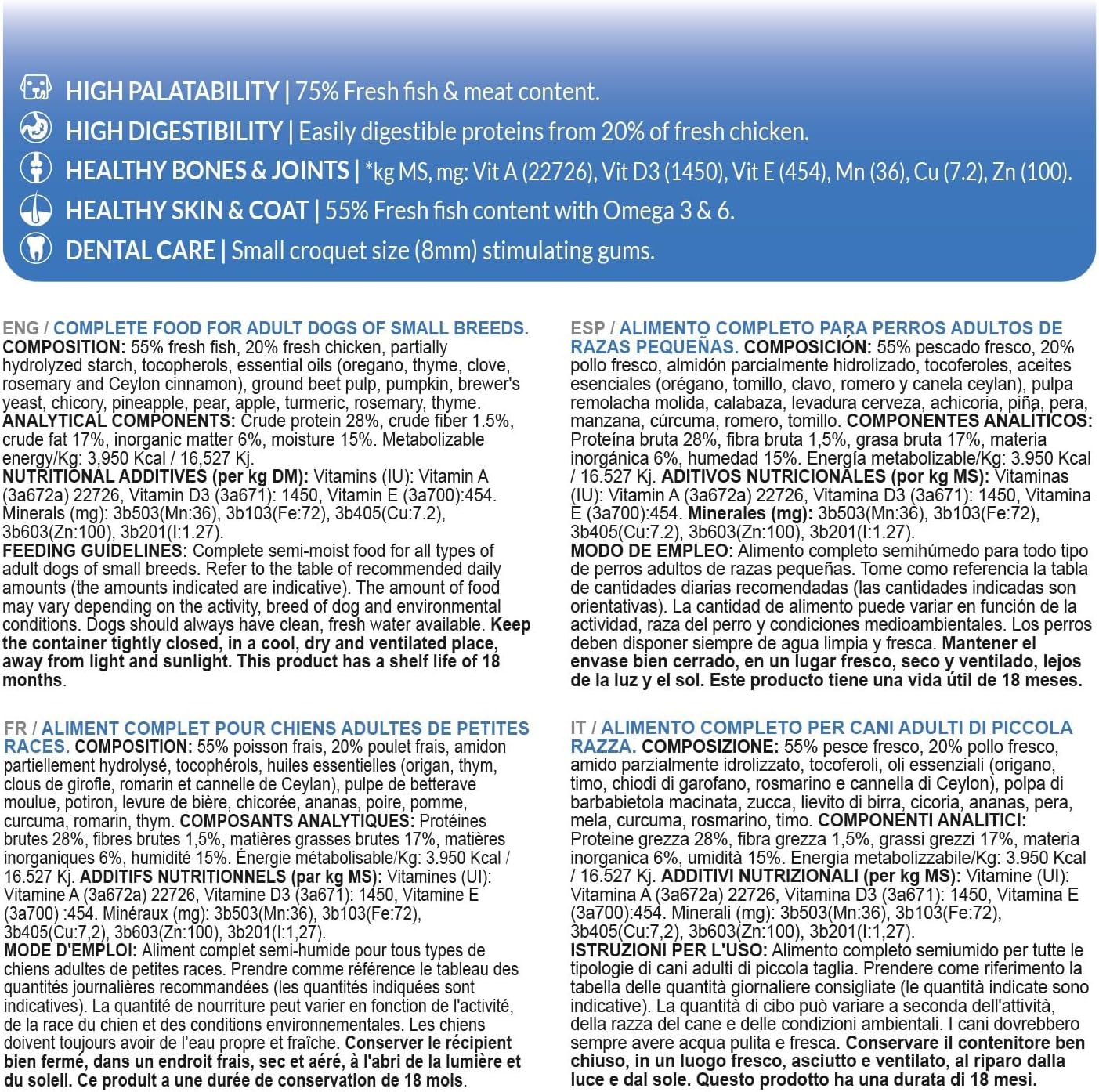 ПЪЛНО ХРАНЕНИЕ ЗА ВЪЗРАСТНИ PERROS DE RAZAS PEQUEÑAS. СЪСТАВ: 55% pescado fresco, 20% pollo fresco, almidón partially hydrolizado, tocoferoles, aceites essentiales (rigan, tomillo, clavo, romero y canela ceylan), pulpa remolacha molida, calabaza, levadura cerveza, achicoria, piña, pera, manzana, куркума, ромеро, томило. АНАЛИЗ НА КОМПОНЕНТИТЕ: Брутален протеин 28%, брутални фибри 1,5%, груба трева 17%, неорганична материя 6%, хумедад 15%. Метаболизирана енергия/Kg: 3,950 Kcal / 16,527 Kj. ХРАНИТЕЛНИ ДОБАВКИ (на kg MS): витамини (UI): витамин A (3a672a) 22726, витамин D3 (3a671): 1450, витамин E (3a700):454. Минерали (mg): 3b503(Mn:36), 3b103(Fe:72), 3b405(Cu:7.2), 3b603(Zn:100), 3b201(I:1.27). MODO OF EMPLEO: Alimento complete semihúmedo за всички видове perros adultsos de razas pequeñas. Tome como referencia la tabla de cantidades diarias recomendadas (las cantidades indicadas son orientativas). The cantidad de alimento puede variar en función de la actividad, raza del perro y ambiente condiciones. Los perros deben dispatcher siempre de agua limpia y fresca. Mantenga the envase bien cerrado, en un lugar fresco, seco y ventilado, lejos de la luz y sol. Този продукт има очаквана продължителност на живот от 18 месеца. ALTA PALATABILIDAD | 75% прясна риба и карне. ALTA DIGESTIBILIDAD | Proteínas de fácil digestión provenientes de un 20% de pollo fresco. HUESOS Y ARTICULACIONES SALUDABLES | *kg MS, mg: витамин A (22726), витамин D3 (1450), витамин Е (454), Mn (36), Cu (7,2), Zn (100). PIEL Y PELO SALUDABLES | 55% прясна риба с Омега 3 и 6. CUIDADO DENTAL | Tamaño pequeño (8 мм), който стимулира енсиите.