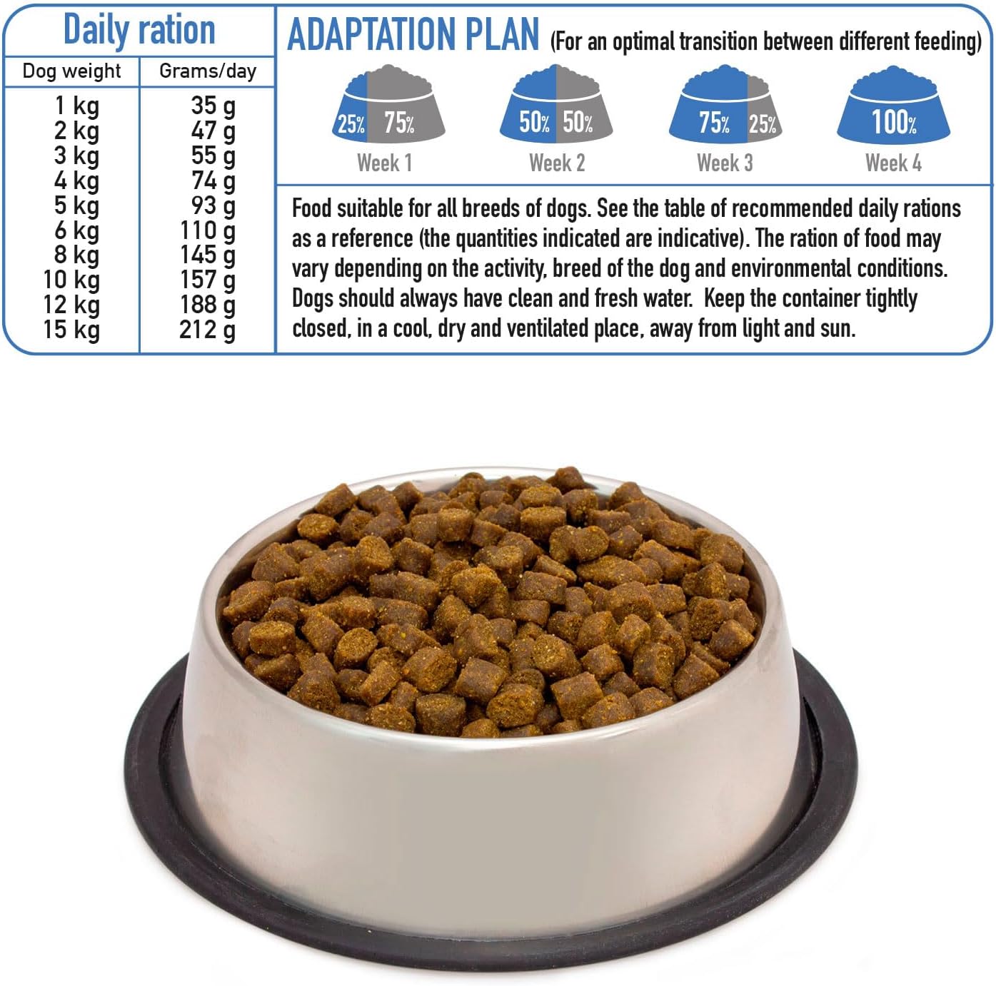 Geeignetes Futter für alle Hunderassen. Die empfohlene Tagesmenge ist in der Tabelle angegeben (die angegebenen Mengen sind Richtwerte). Die Futtermenge kann je nach Aktivitätsniveau, Rasse und Umweltbedingungen des Hundes variieren. Hunde sollten immer Zugang zu sauberem, frischem Wasser haben. Behälter gut verschlossen an einem kühlen, trockenen und belüfteten Ort aufbewahren. Vor Licht und Sonnenlicht schützen. Die Haltbarkeit beträgt 15 Monate. Chargennummer: siehe Verpackungsunterseite. Mindestens haltbar bis: siehe Verpackungsunterseite. Hergestellt in der Europäischen Union für Arquivet, S.L.U. Herstellernummer: siehe Verpackungsunterseite.