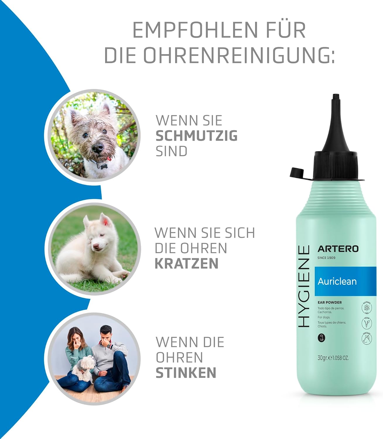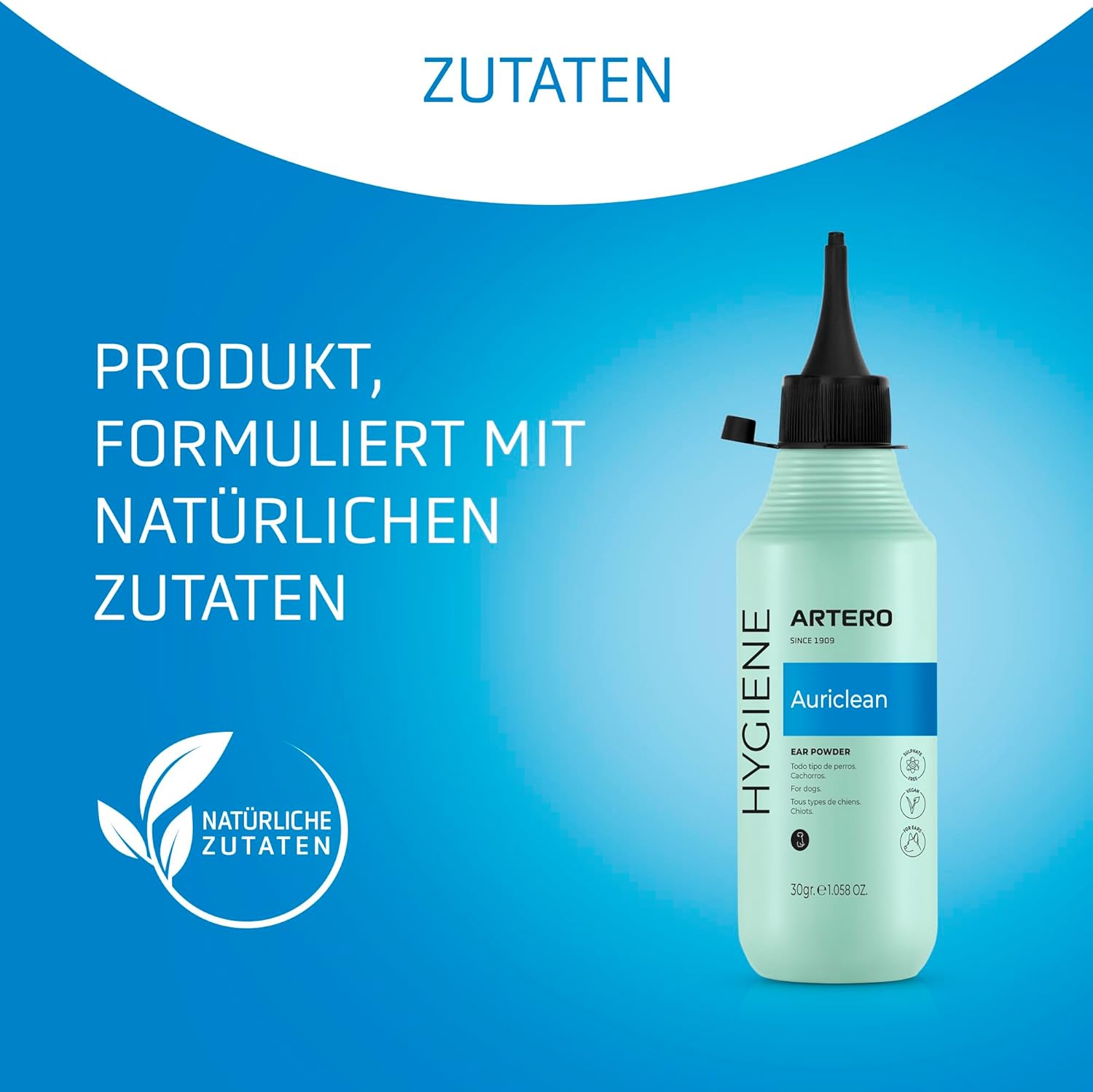 Приложение: Нанесете прах Auriclean в ушния канал. Уверете се, че продуктът покрива всички косъмчета и коренчета. Масажирайте.