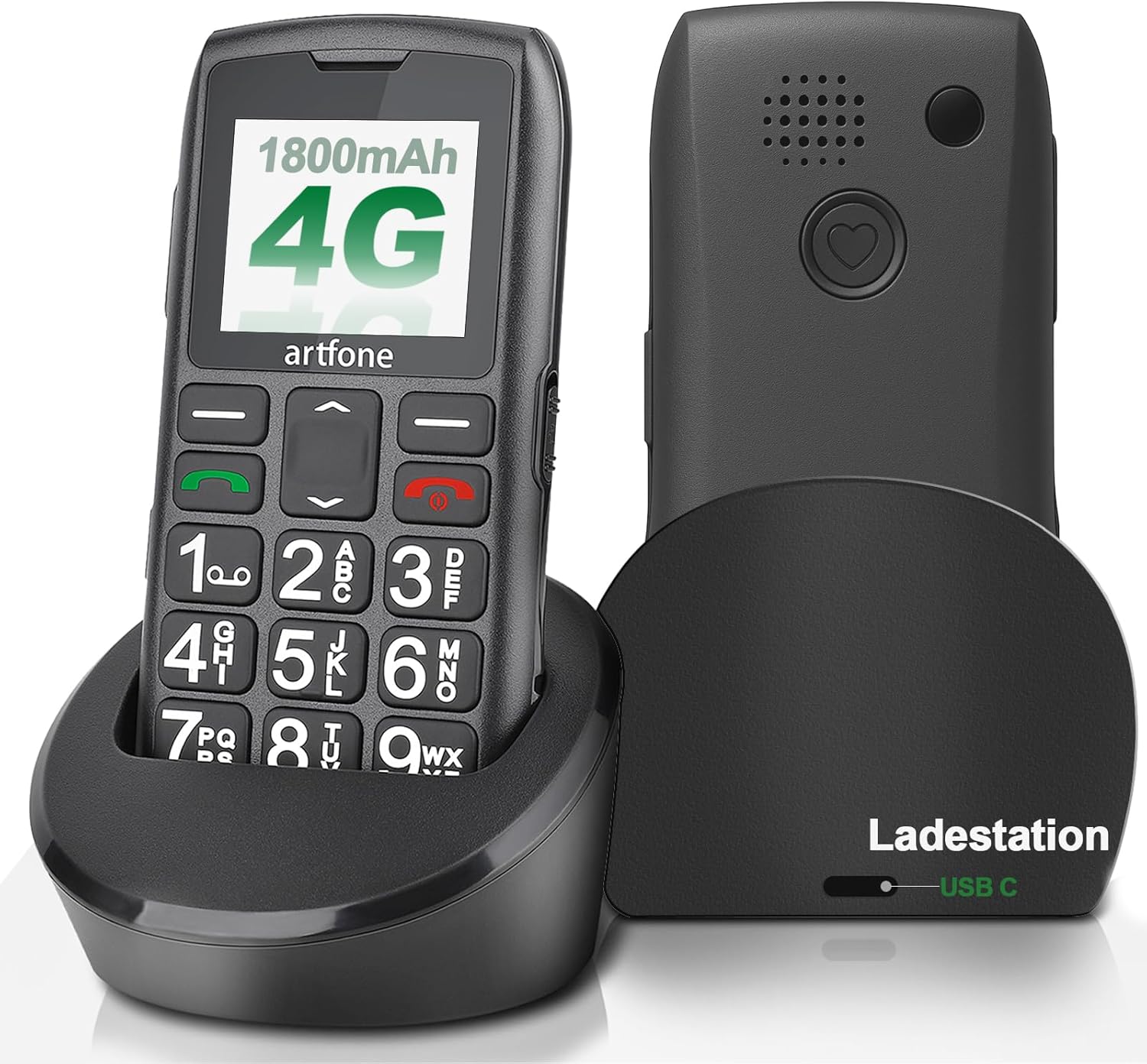 • Батерия с капацитет 1800 mAh и практична станция за зареждане: станцията за зареждане artfone 4G позволява лесно зареждане: просто поставете мобилния телефон в станцията и процесът на зареждане започва автоматично. Освен това, устройството може да се зарежда бързо и безопасно чрез USB-C кабел. Така телефонът ви е готов за употреба по всяко време.