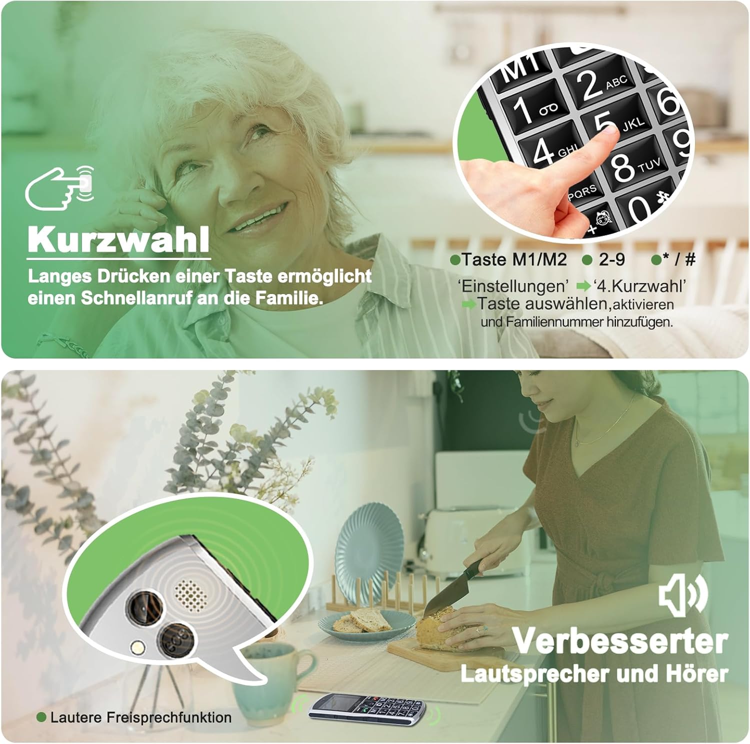 • Мобилен телефон за възрастни хора с особено лесна работа: Този телефон за възрастни хора има удобна за потребителя операционна система с изключително големи шрифтове и ясни икони на менюто. Физическата клавиатура е с подсветка, така че можете лесно да набирате дори на тъмно – свеждайки до минимум грешното въвеждане. Силните високоговорители с висока резолюция осигуряват ясно разбиране.