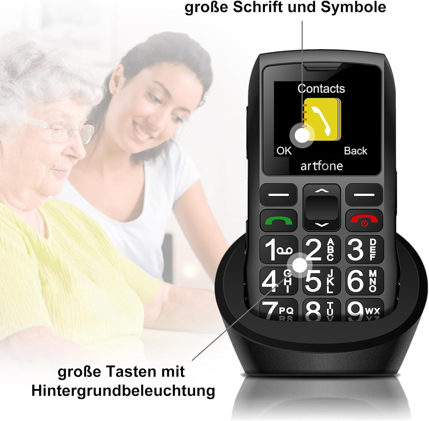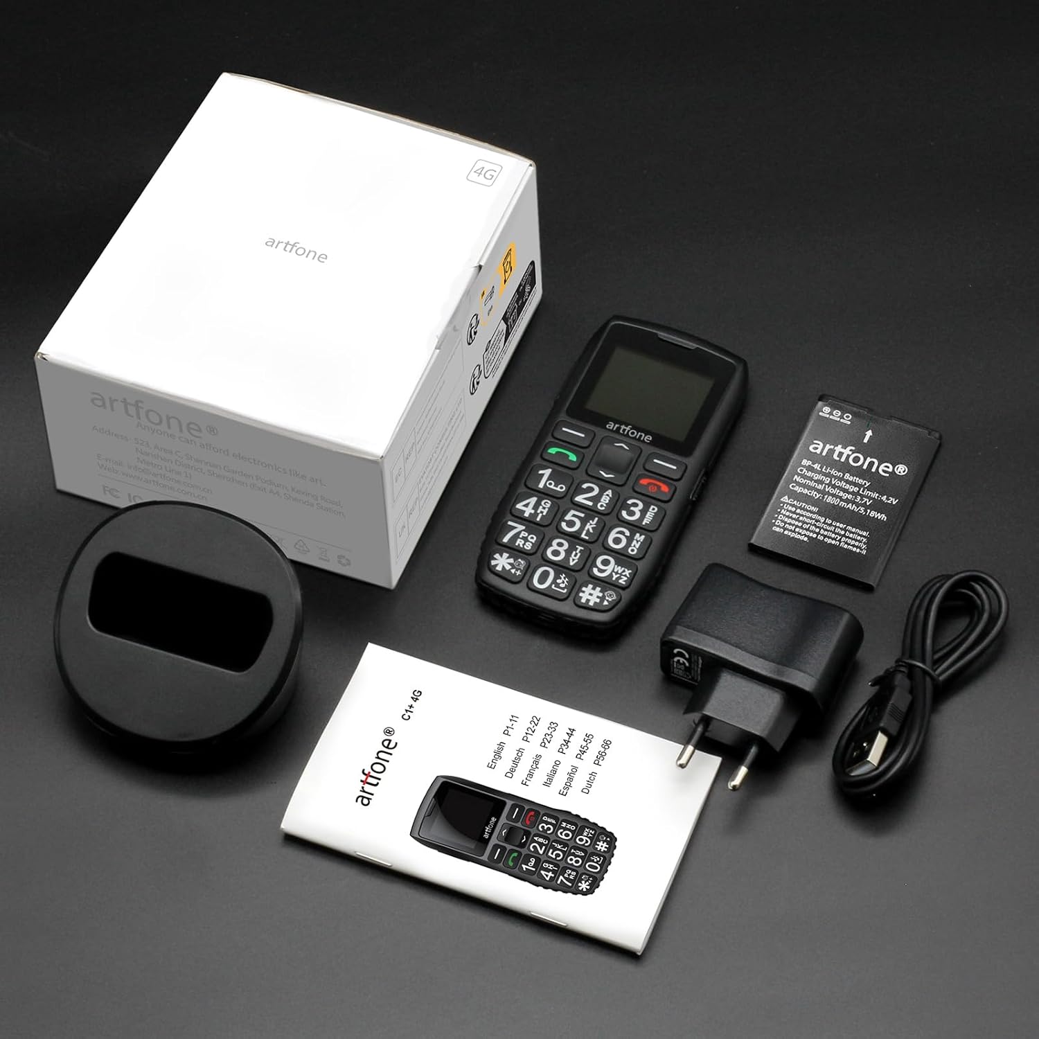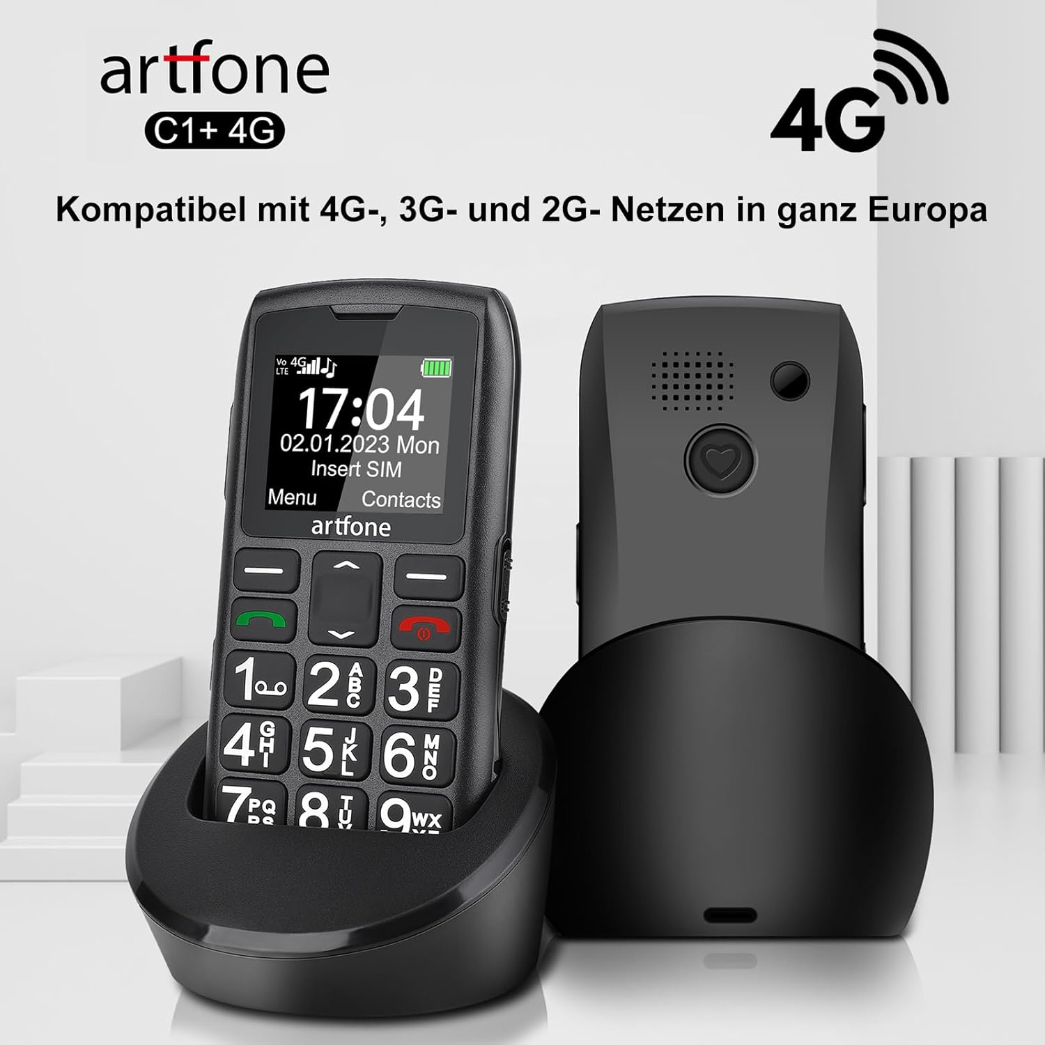 artfone C1+ 4G Мобилен телефон за възрастни без договор, бутон за спешно повикване SOS, станция за зареждане, високоговорител, бързо набиране, Bluetooth, USB-C | Прост, здрав мобилен телефон с камера | Меню на немски език | Голямо