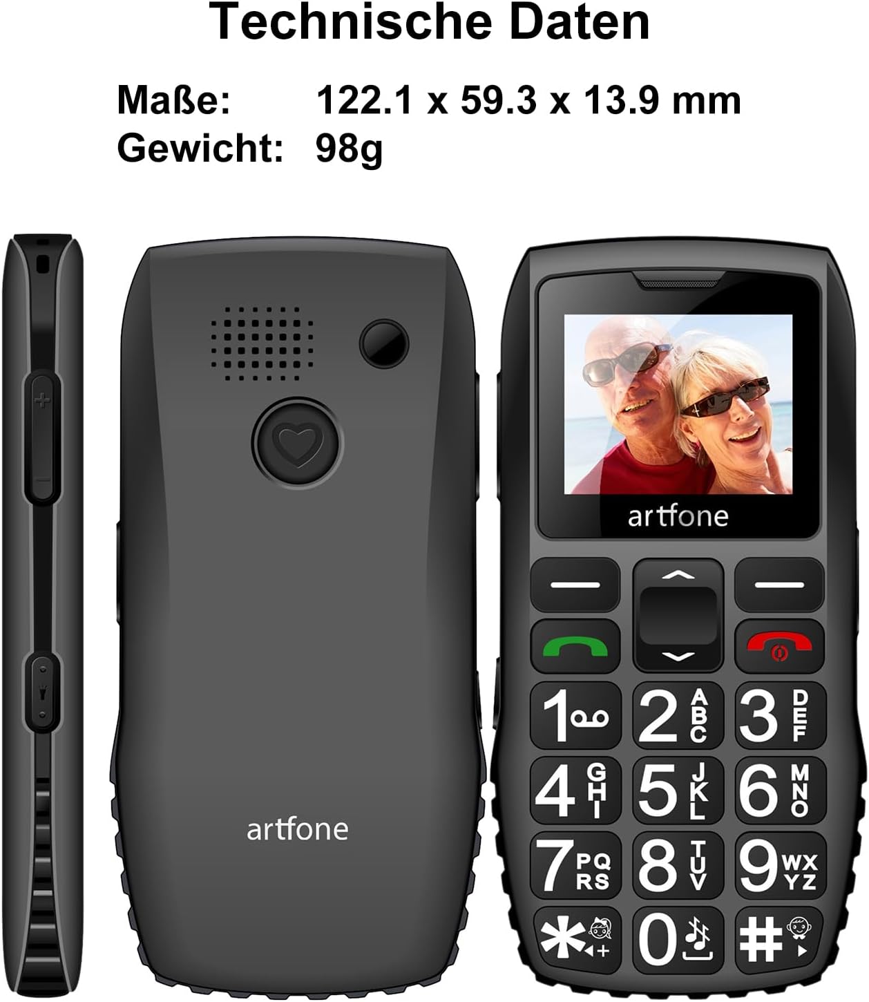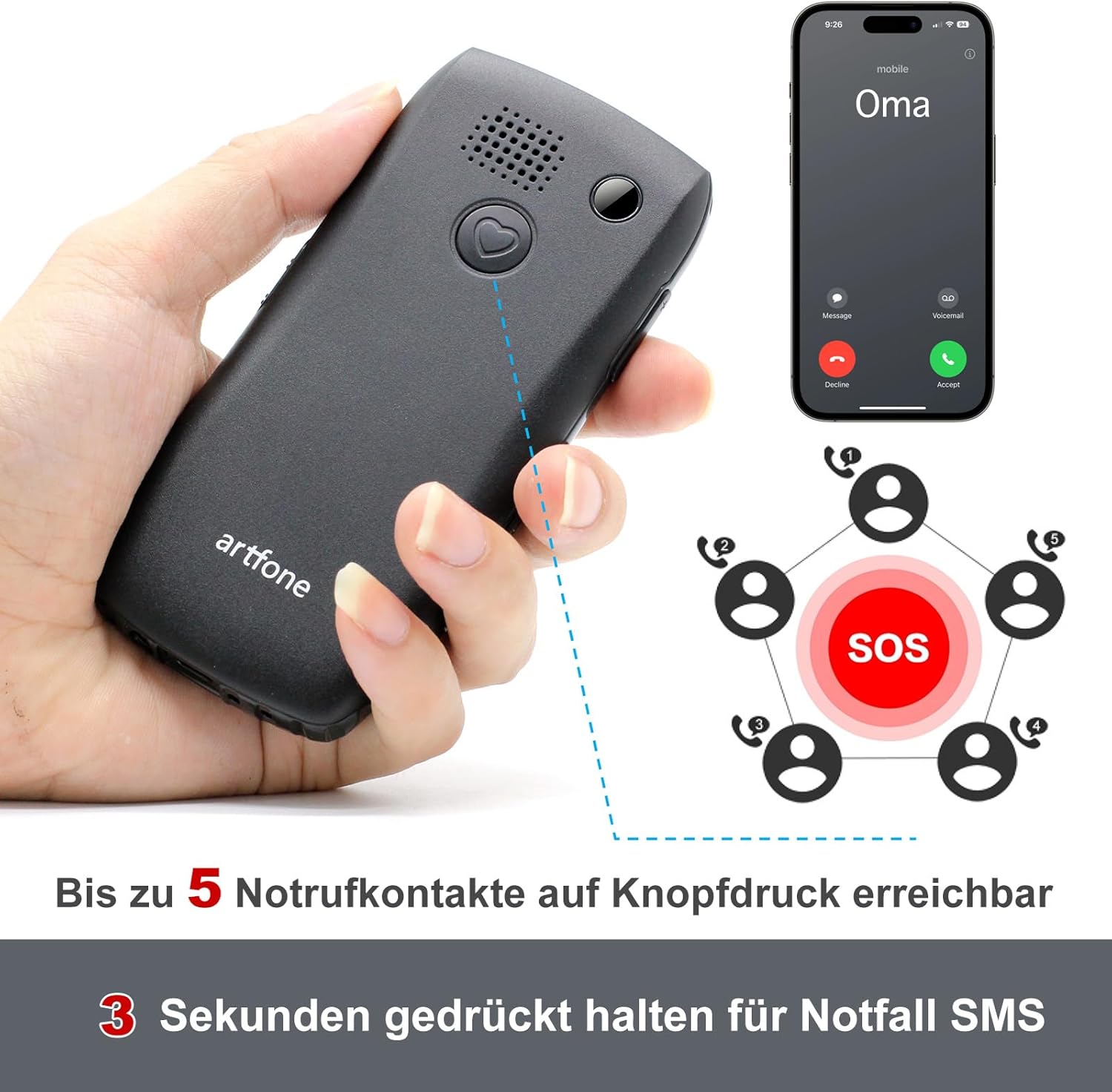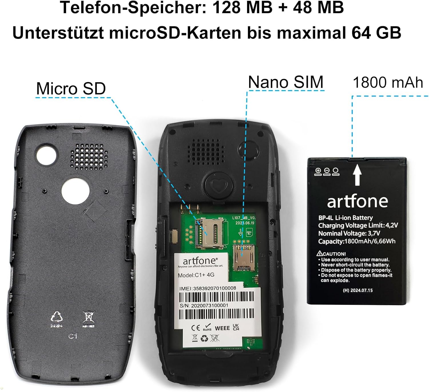 artfone C1+ 4G Мобилен телефон за възрастни без договор, бутон за спешно повикване SOS, станция за зареждане, високоговорител, бързо набиране, Bluetooth, USB-C | Прост, здрав мобилен телефон с камера | Меню на немски език | Голямо