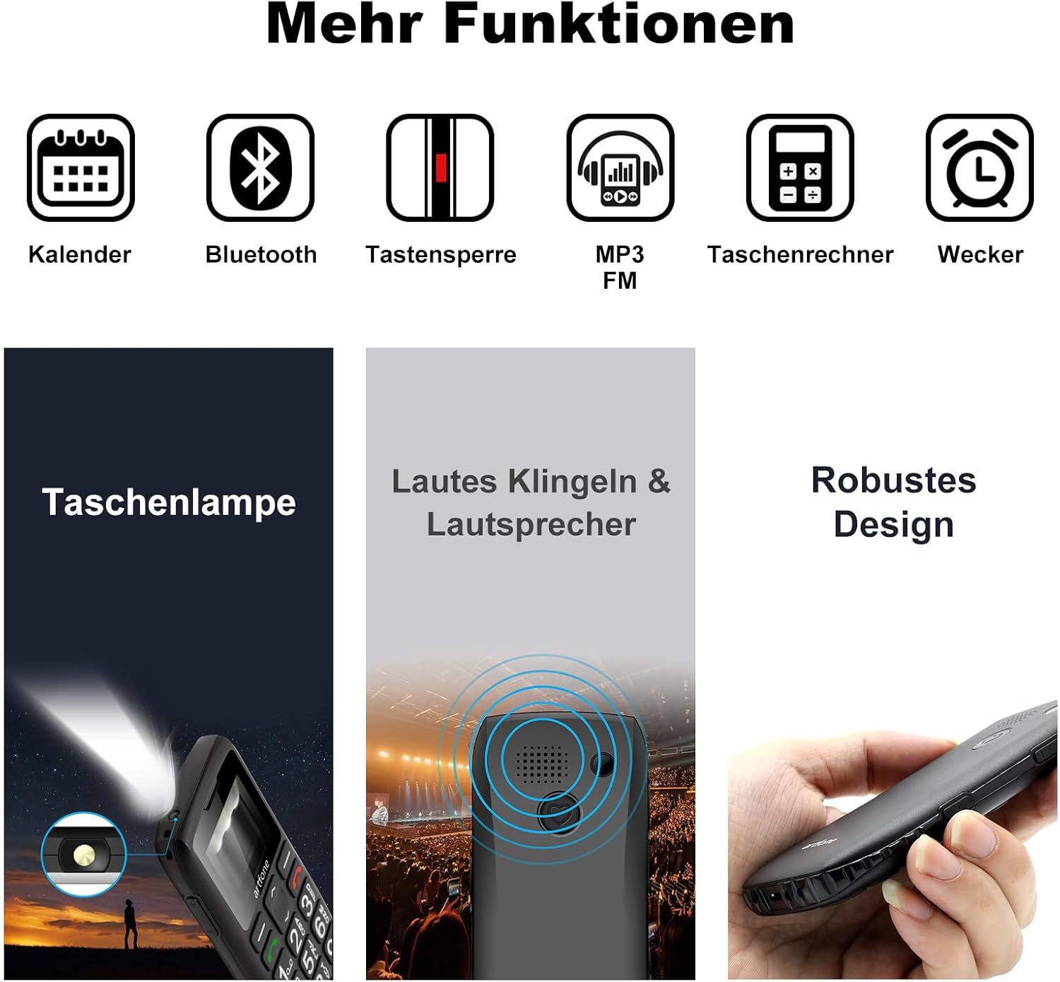 • Здрав, лесен за употреба телефон: големи осветени бутони, силен тон на звънене, меню на немски (с възможност за превключване към 21 други езика).