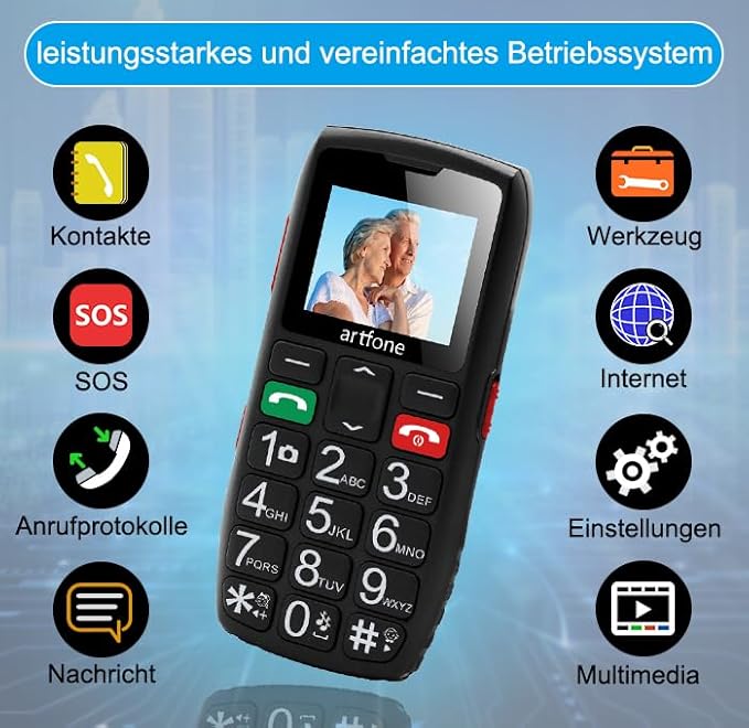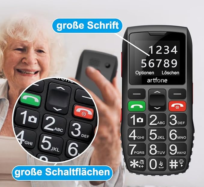 artfone C1 Senior мобилен телефон без договор, мобилен телефон с големи бутони, GSM мобилен телефон с две SIM карти за пенсионери, функция за обявяване на времето, бутон за спешно повикване SOS, 1.8-инчов цветен дисплей.