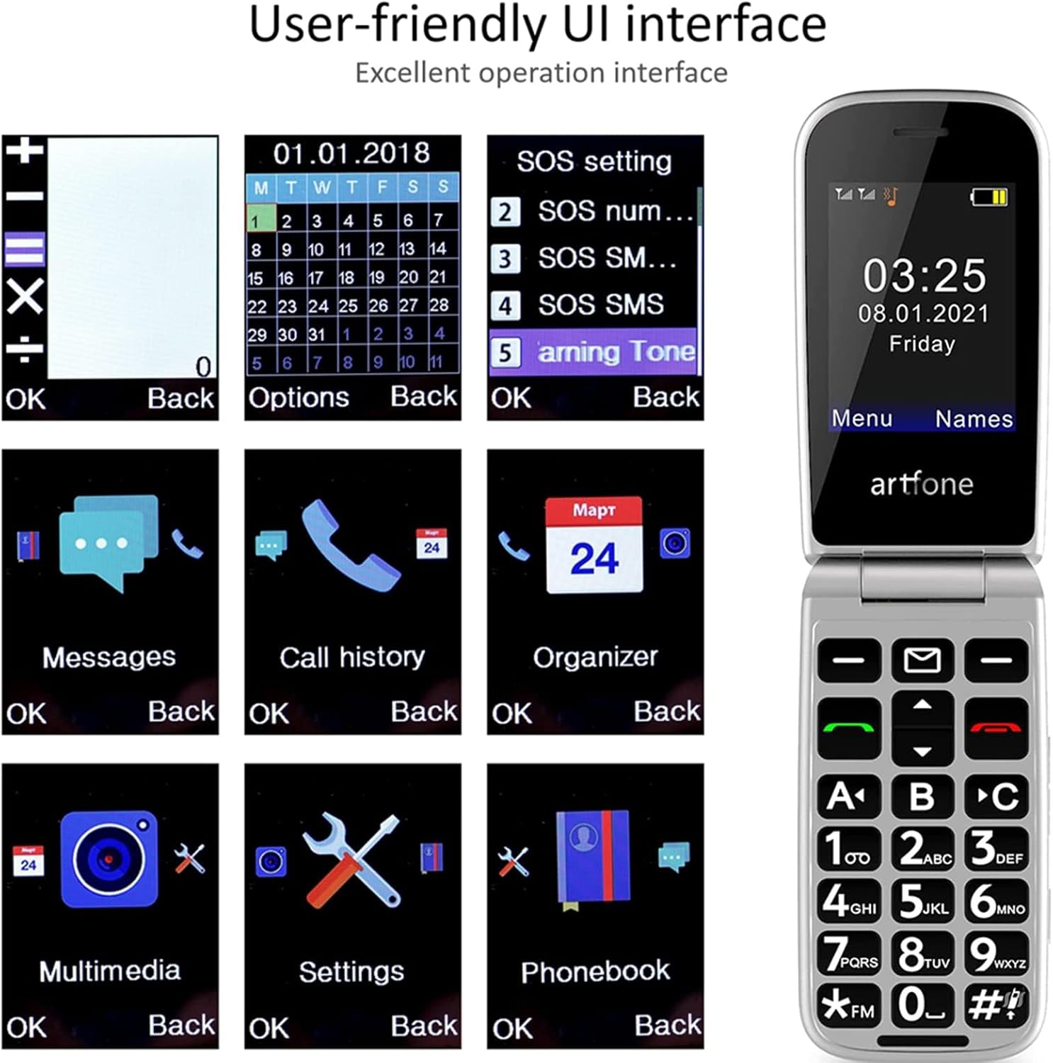 • Удобен за потребителя дизайн за възрастни хора: Artfone F20 е сгъваем мобилен телефон, специално проектиран за възрастни хора, с 2,4-инчов цветен екран и голям формат, лесни за четене символи. Интуитивното меню с ясни икони и големи бутони го прави лесен за използване, особено за потребители, които имат затруднения с малките бутони. Тънкият и компактен дизайн улеснява носенето на телефона в чанта.