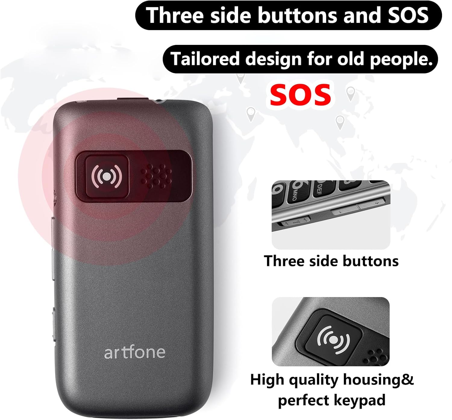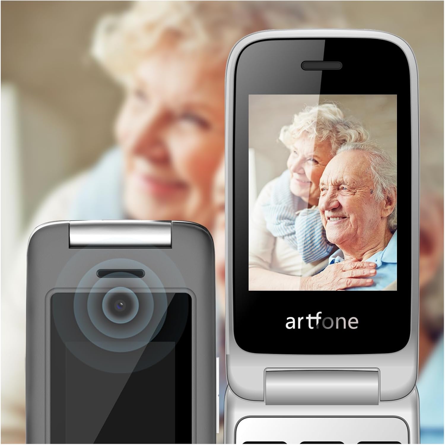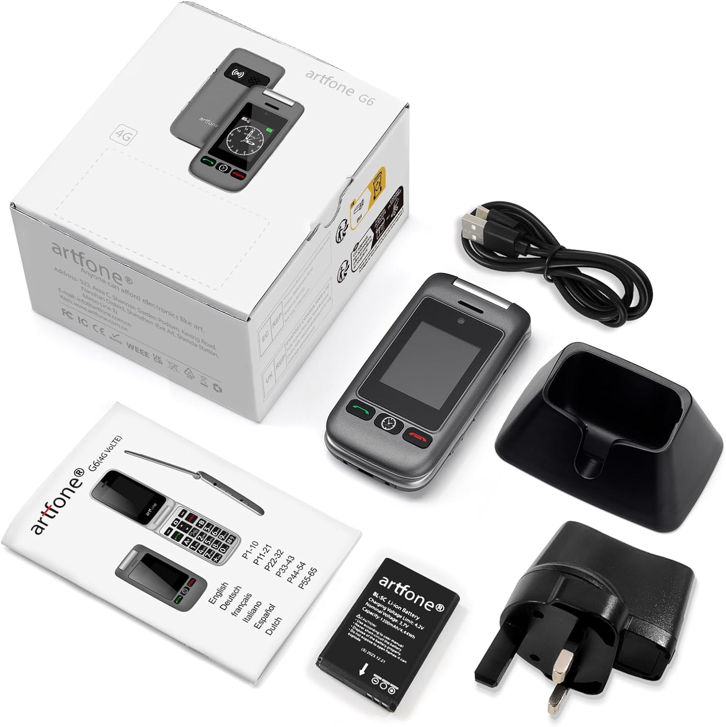 artfone G6 4G Мобилен телефон за възрастни хора Сгъваем мобилен телефон без договор, Големи бутони, Мобилен телефон, Бутон за спешно повикване SOS, Станция за зареждане, Високоговорител, Quick Force, Мобилен телефон за възрастни хора, FM