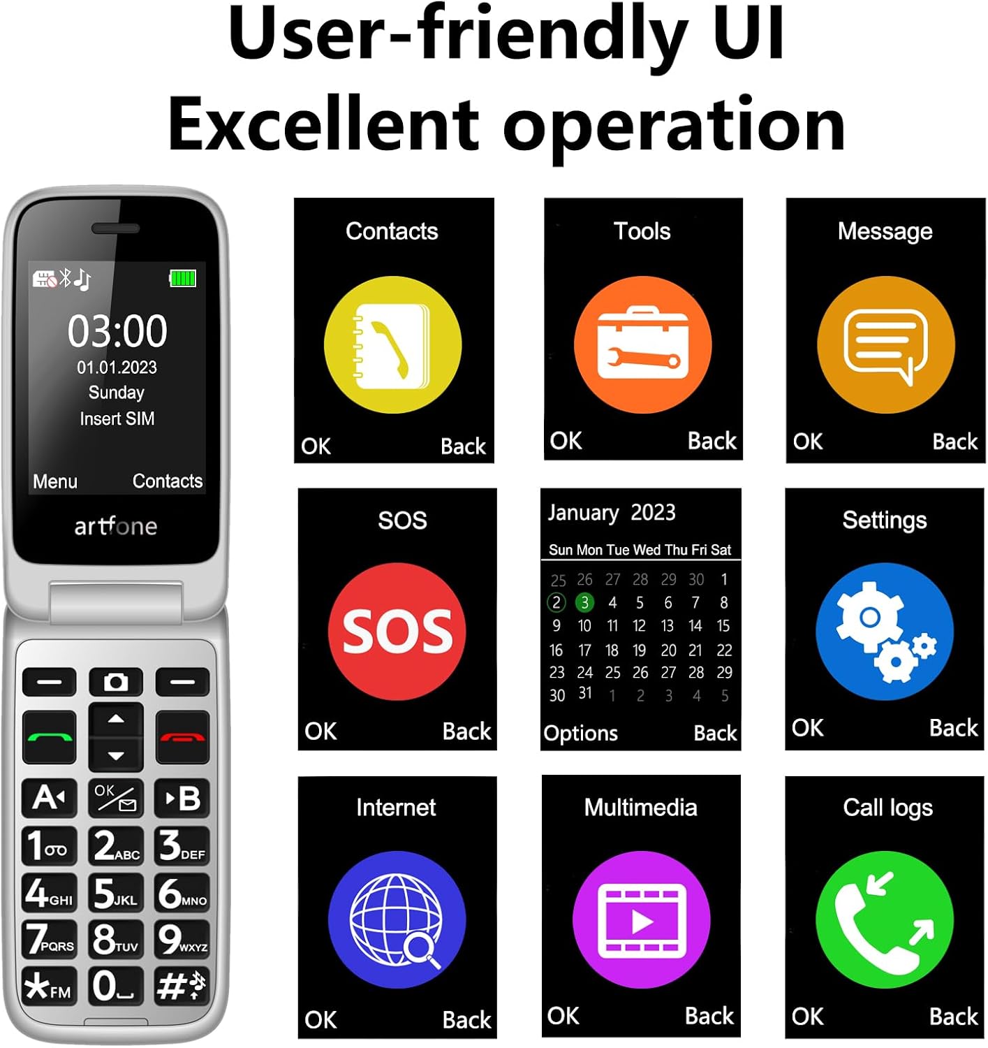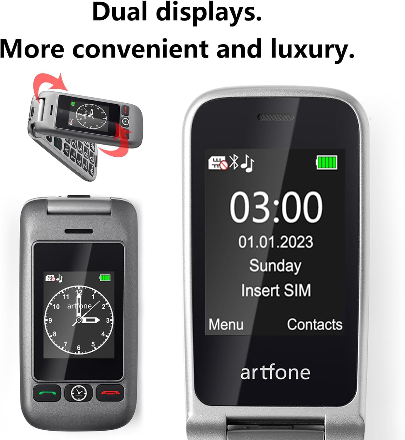 • Лесен за употреба и ясен гласов изход: artfone C1+4G е специално проектиран за възрастни хора и предлага интуитивен потребителски интерфейс с големи символи и шрифтове. Функцията за гласов изход позволява часът да бъде обявяван с едно натискане на бутон на различни езици - идеално за хора с увредено зрение, които не разчитат на малки дисплеи на часовника.