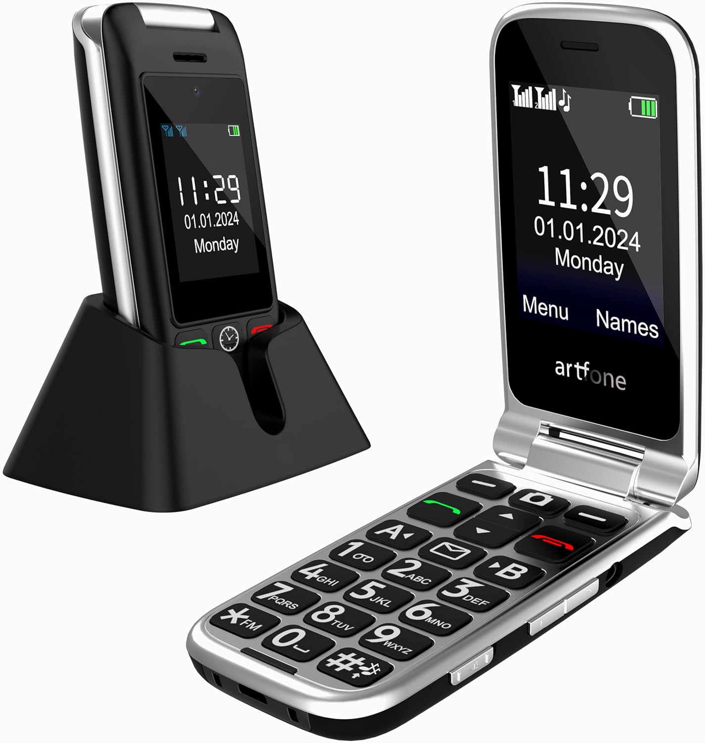 artfone G6 4G Мобилен телефон за възрастни Сгъваем мобилен телефон без договор, Големи бутони, Мобилен телефон, Бутон за спешно повикване SOS, Станция за зареждане, Високоговорител, Бързо форматиране, 2.4-инчов двоен екран, Мобилен