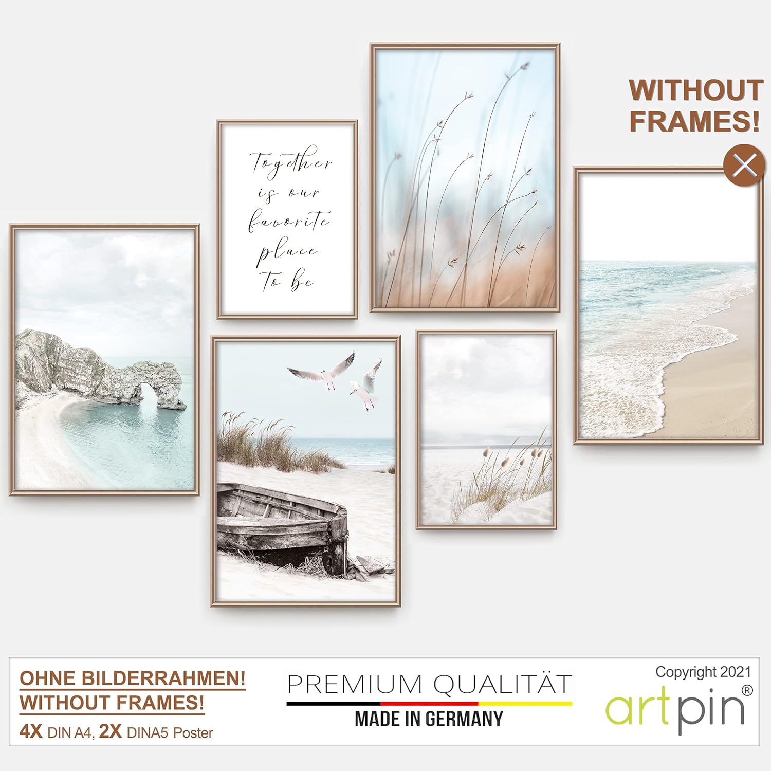 artpin® Комплект модерни постери - Картини Декорация за хол Спалня - Пампаска трева Бежов морски плаж Стена за картини без рамка (4 x A4 | 2 x A5) W12