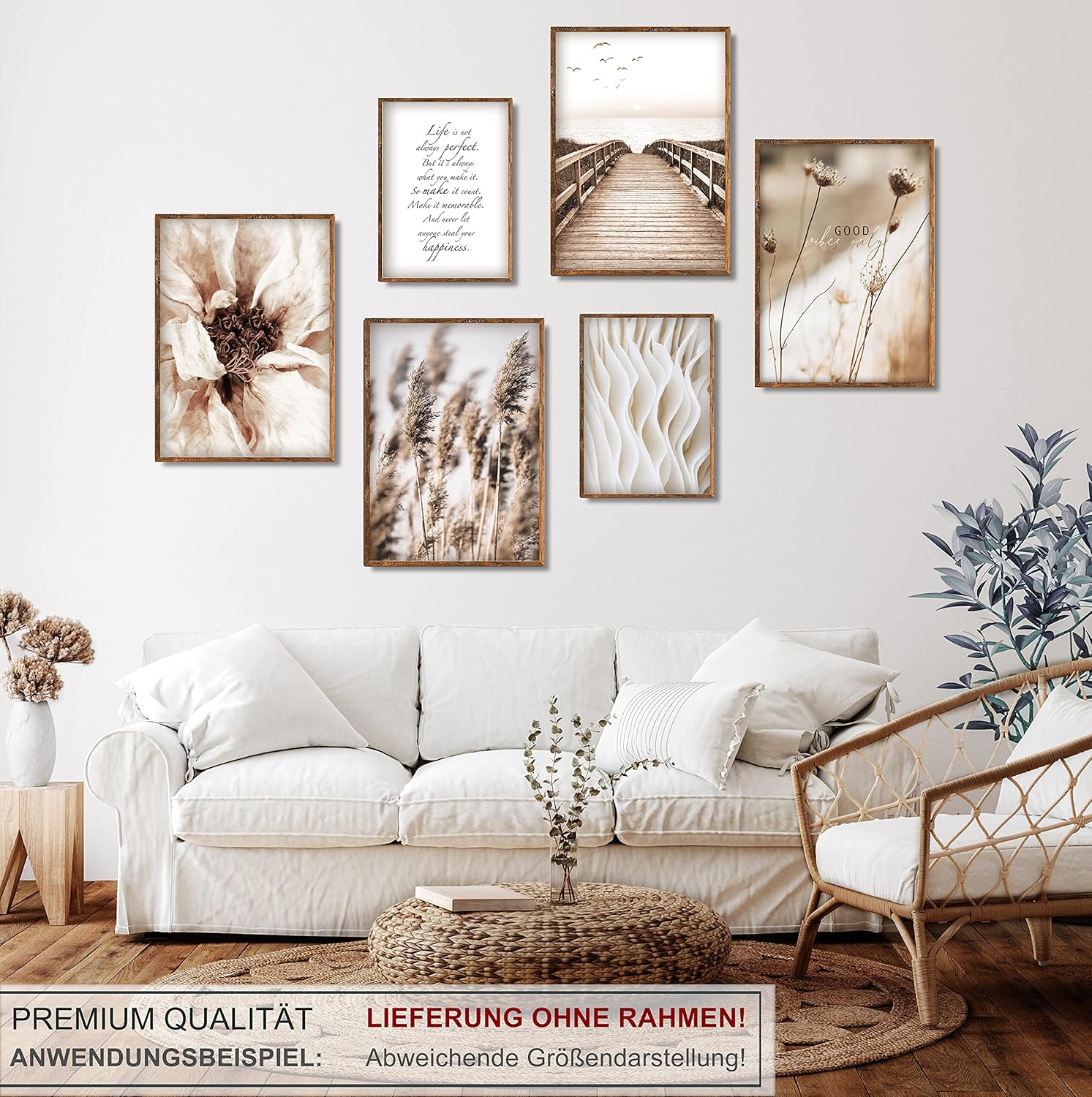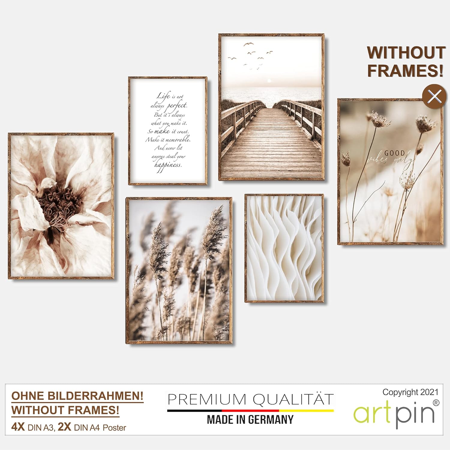 artpin® W16 Комплект модерни постери, Картини за декорация на хол и спалня, Мотиви пампас/дива трева/море в бежово, Нерамкирано стенно изкуство (4 x A3 + 2 x A4)