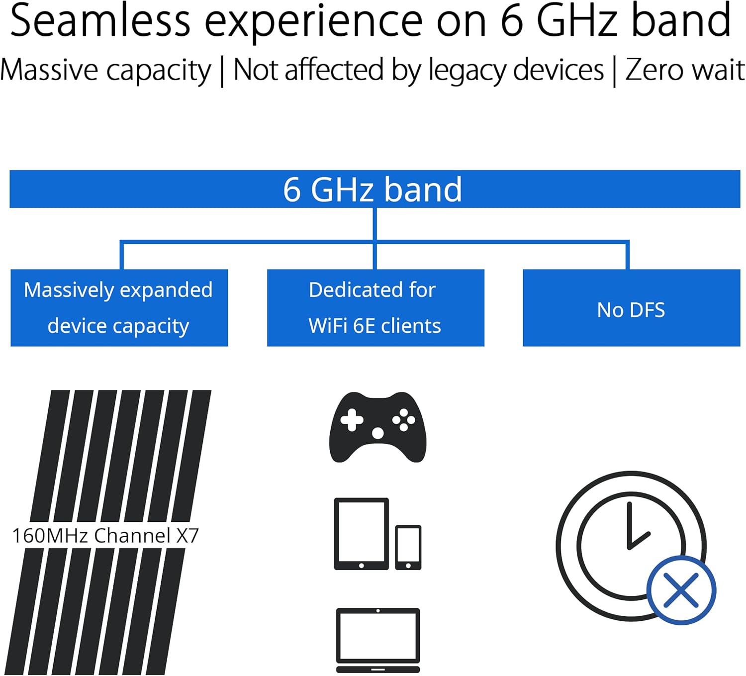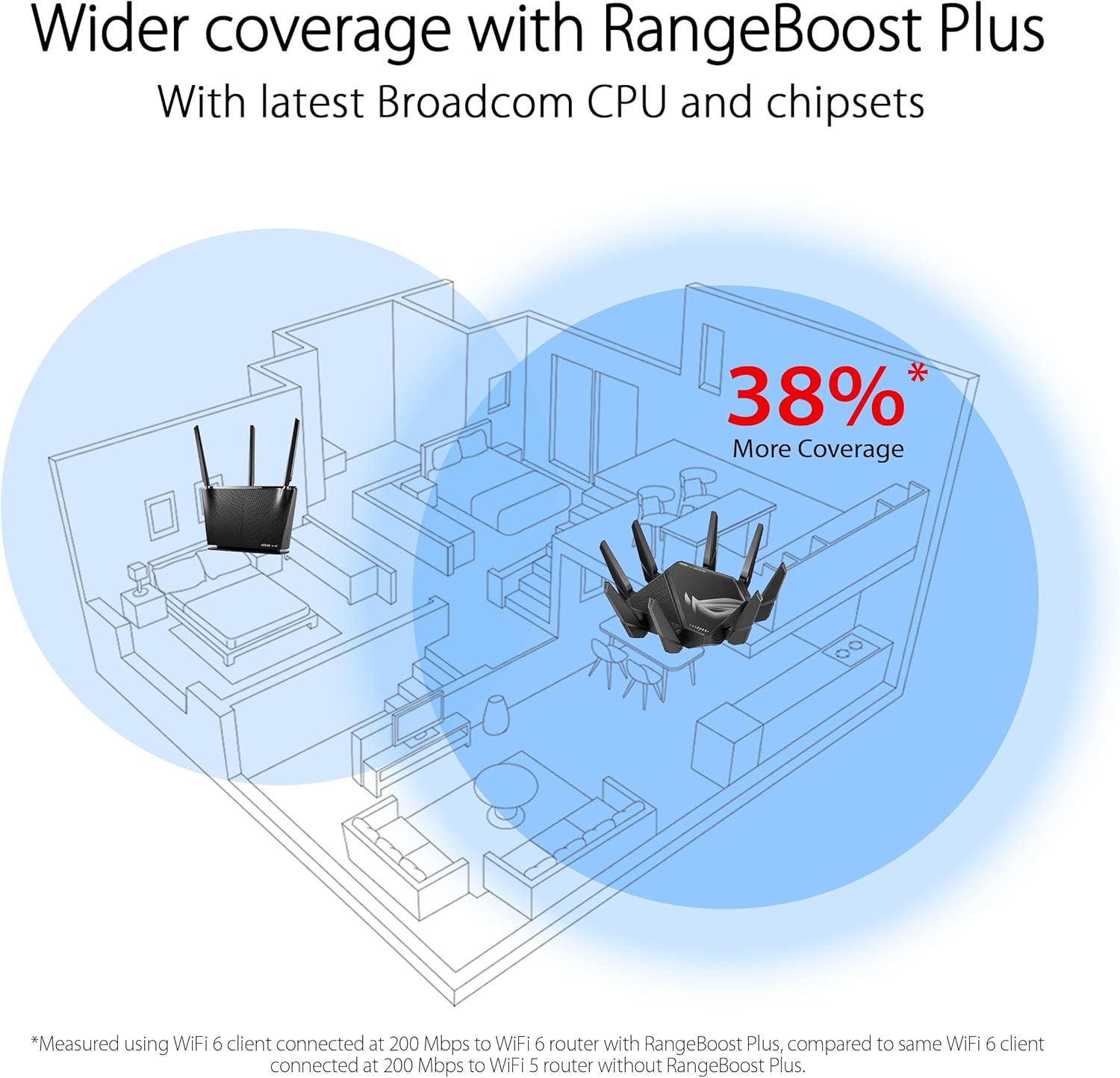 Проектирахме TUF Gaming AX6000, за да ви осигурим възможно най-голямото WiFi покритие. Той използва OFDMA, нова технология от WiFi 6, която позволява на сигналите да се разпространяват по-далеч, отколкото с WiFi 5. С 4x4 MIMO конфигурация и отделни 2.4 GHz и 5 GHz антени за намаляване на смущенията, както и други подобрения, като например beamforming, който фокусира сигнала върху всяко устройство, TUF Gaming AX6000 достига до всеки ъгъл.