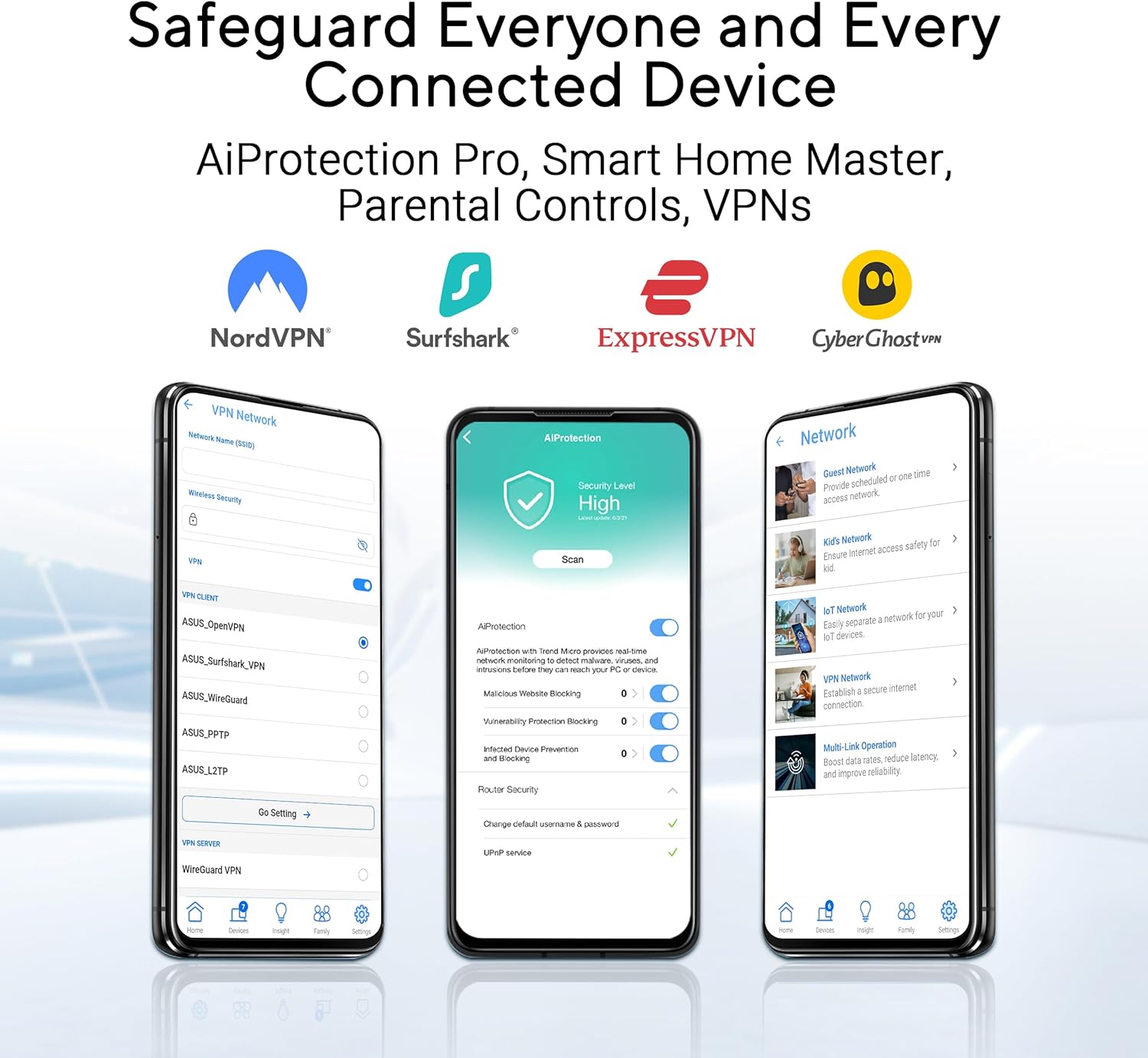 Erweitern Sie Ihr Smart Home mit ultraschnellem Tri-Band-WiFi 7 mit Geschwindigkeiten von bis zu 9300 Mbit/s, verbesserter Abdeckung mit der KI-unterstützten Smart AiMesh-Technologie und bis zu 20G Kabelkapazität. Der ASUS RT-BE92U bietet überragendes 6 GHz WiFi und ein 10G-Netzwerk der nächsten Generation. Mit ASUS Network Security der nächsten Generation und einer Reihe von fortschrittlichen Netzwerktechnologien wie IoT Network schützt der RT-BE92U Ihr Netzwerk rund um die Uhr.