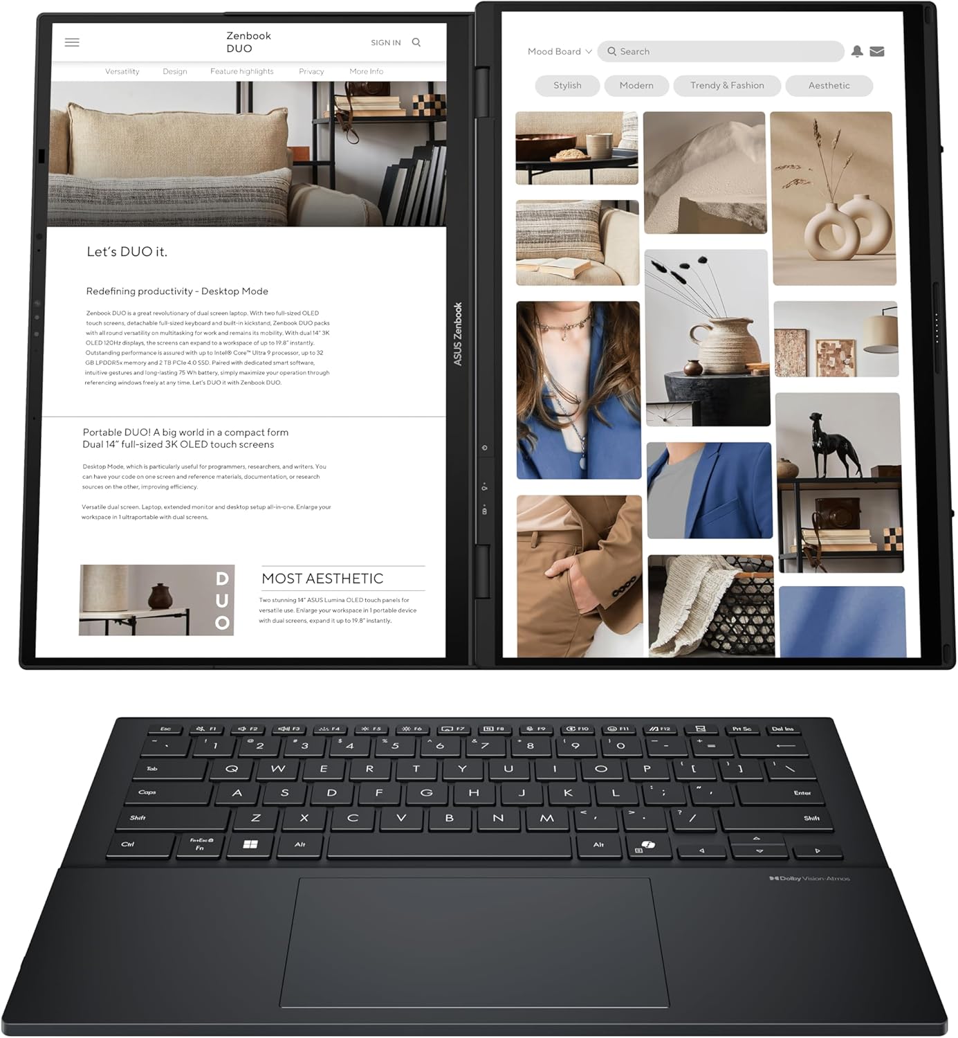 ASUS Zenbook DUO съчетава изключителен дизайн с максимална производителност и гъвкавост. Благодарение на двата си ултра-ясни Lumina OLED сензорни дисплея, лаптопът отговаря на всички изисквания и насърчава продуктивността и творческото мислене със своята новаторска технология и широка гама от приложения. Благодарение на гъвкавите опции за въвеждане и презентации, както и на мощния процесор до Intel® Core™ Ultra 9 (Series 2) с поддръжка на изкуствен интелект и интегрирана графика Intel® Arc, желаната производителност е винаги налична. Многозадачността и сложните мултимедийни проекти също не са проблем с ултрабързата RAM памет. Zenbook DUO е олицетворение за максимална производителност, която се адаптира към живота.