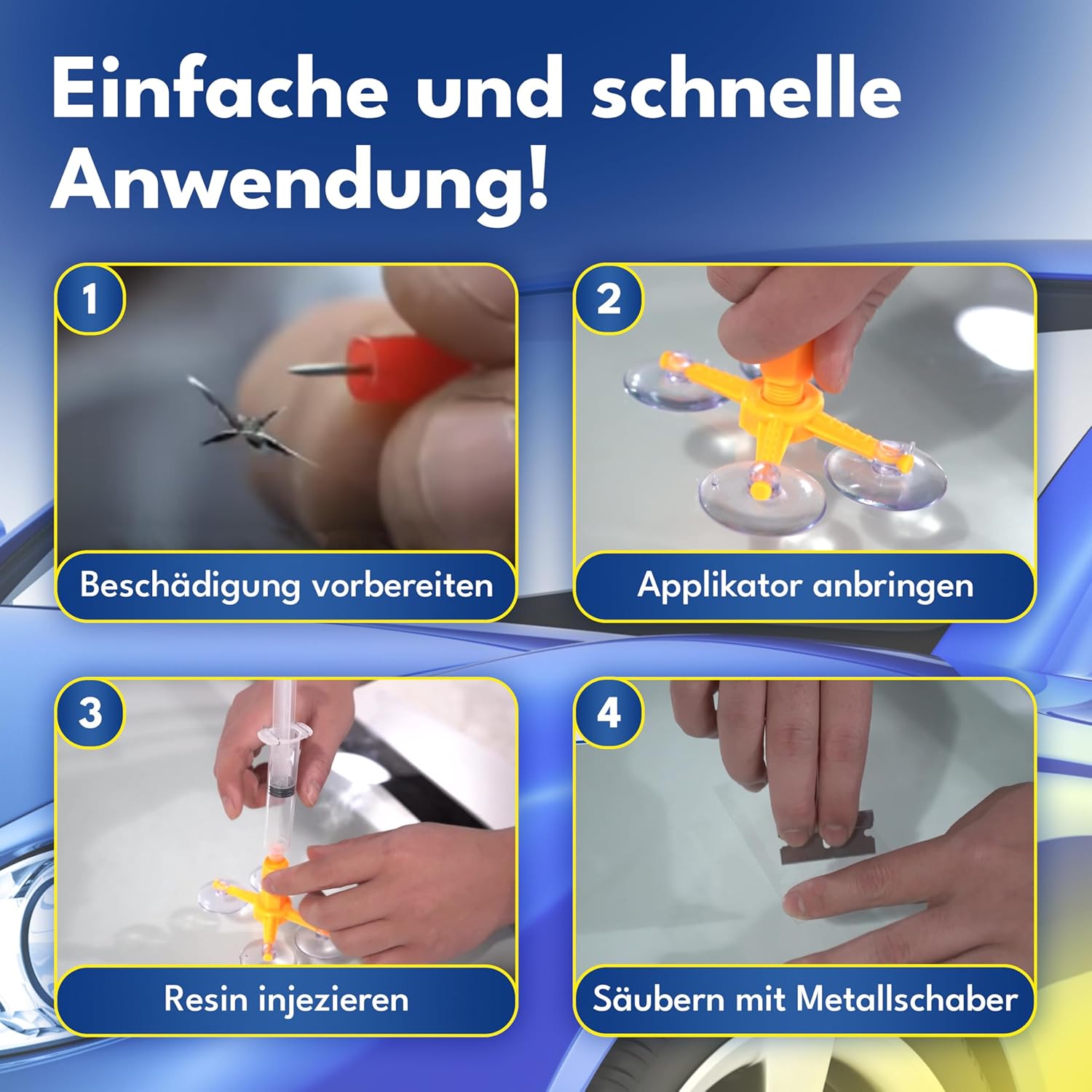 • Лесен за употреба без предварителни познания: благодарение на инструкциите стъпка по стъпка, държача за вендуза и UV лампата, приложението е лесно и безопасно. Не са необходими инструменти. Перфектен за бързи ремонти у дома, в гаража или в движение - подходящ и за начинаещи.