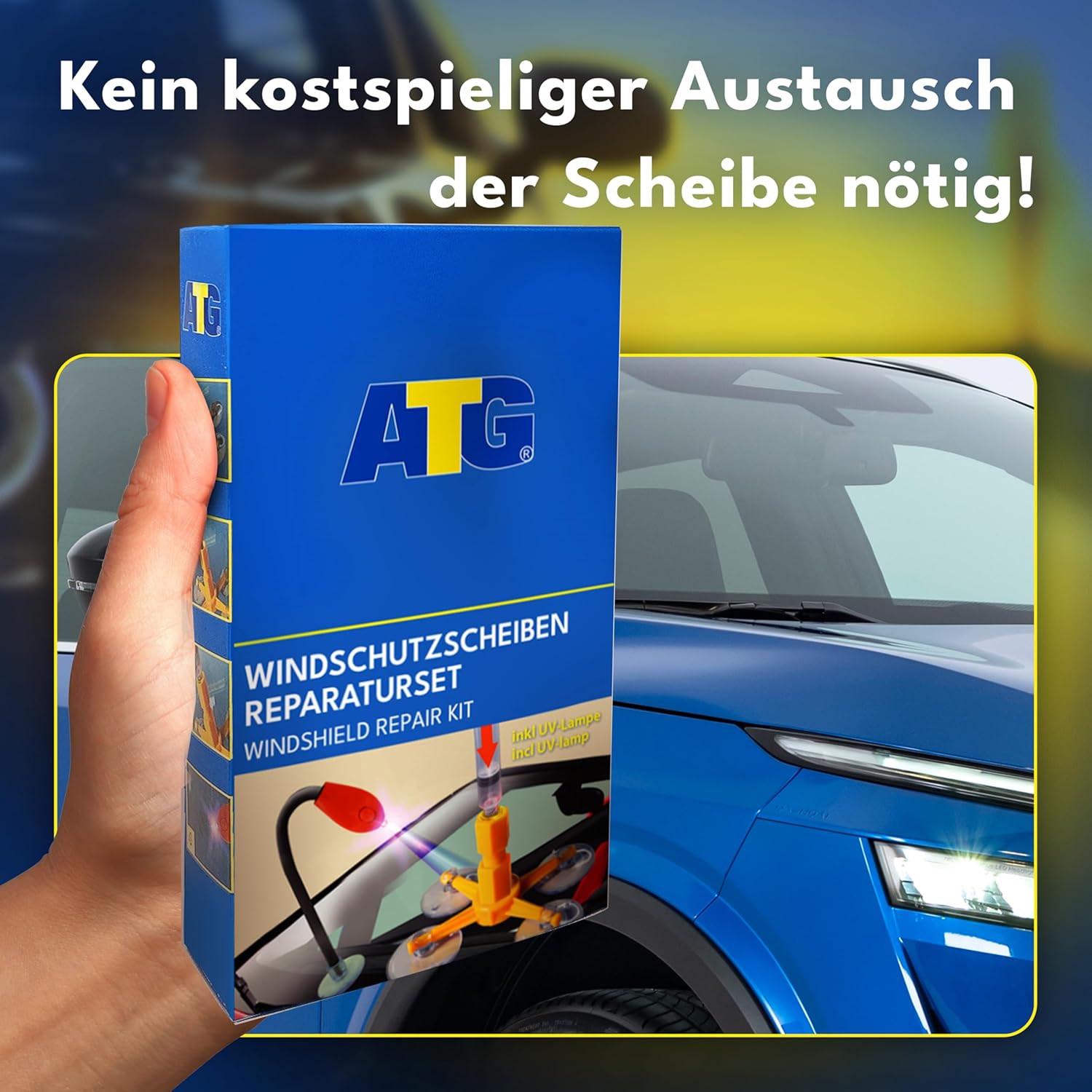 ATG Windshield-FIX – Комплект за ремонт на предно стъкло за отстраняване на пукнатини и драскотини по предните стъкла с UV лампа – Комплект за ремонт на следи от камъчета 20 бр.