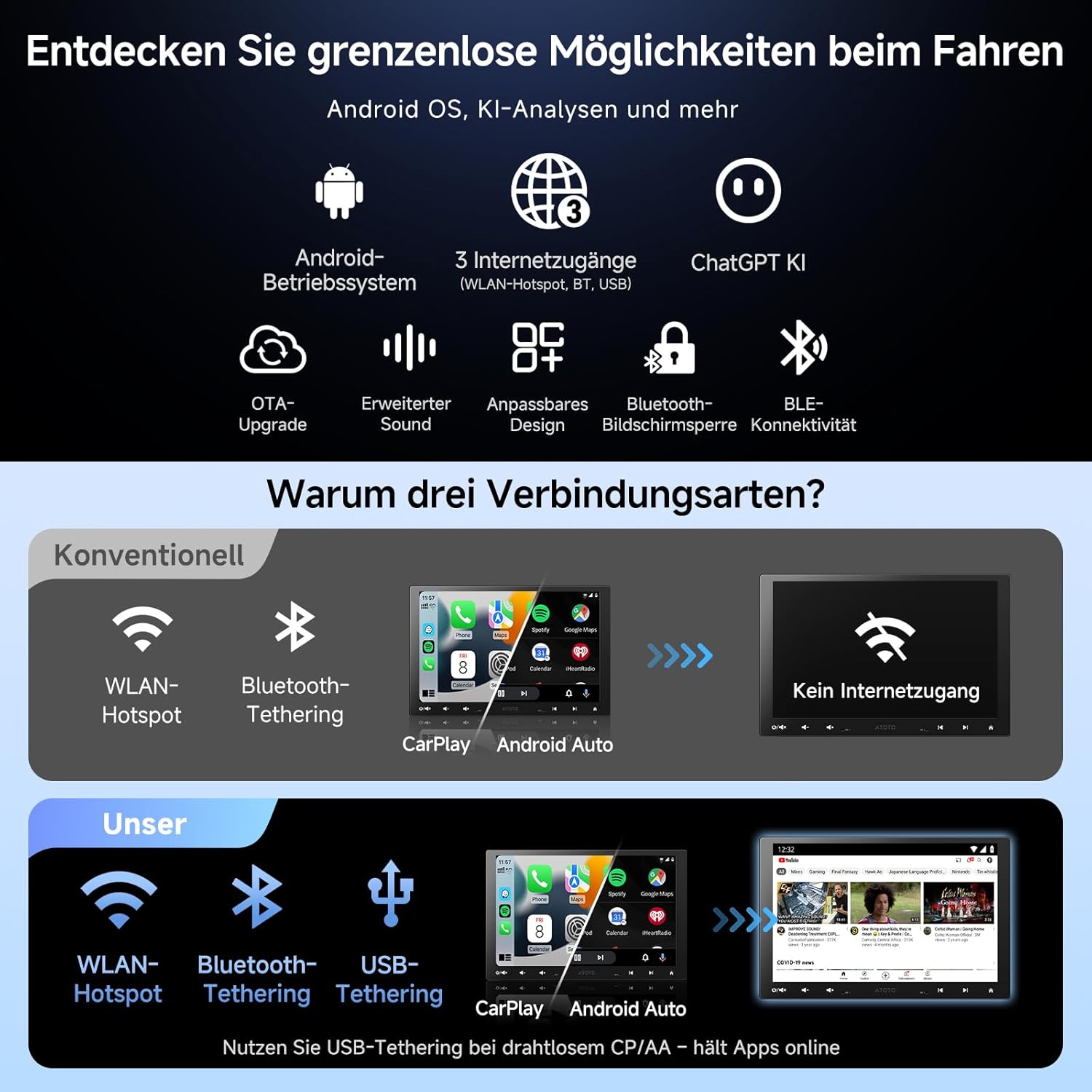 • Безжичен CarPlay и Android за кола: безжично използване на CP/AA. Лесен достъп до карти, обаждания и музика, като същевременно поддържате таблото си подредено и фокусирано върху пътя.