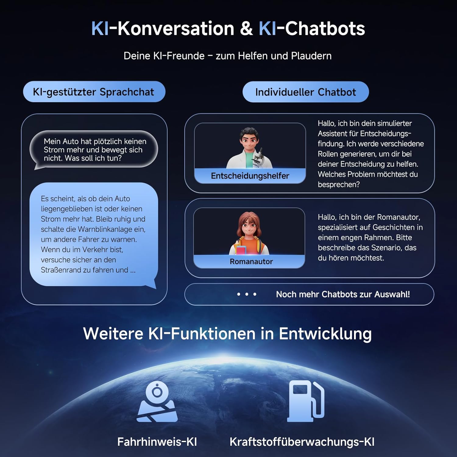 • Интелигентен изкуствен интелект и персонализирани приложения: Подобрете всяко пътуване с вградения DriveChat AI Assistant, GPS проследяване (TrackHU), ClotHub и камерата за задно виждане с LRV (Live Rear View) - за по-интелигентно и по-интерактивно шофиране.
