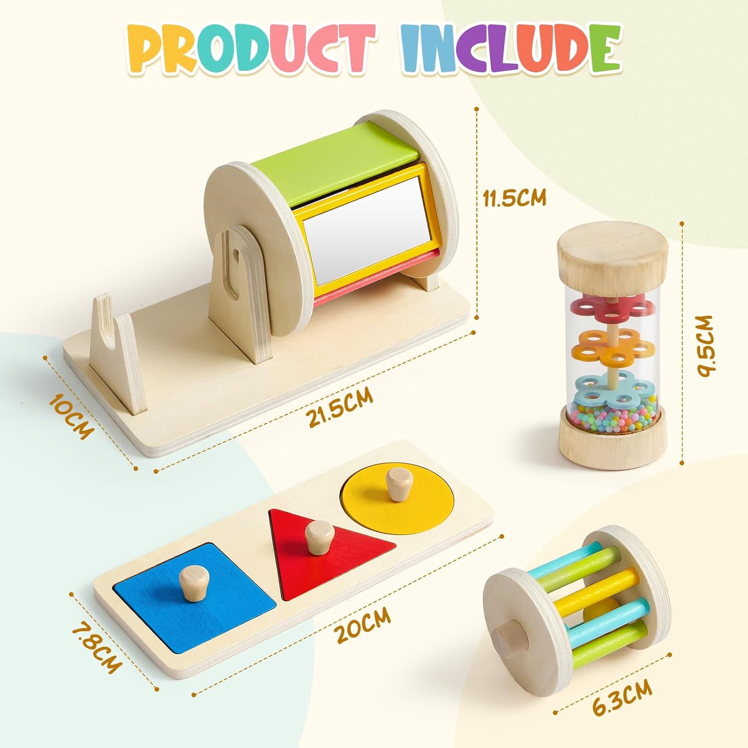 Тази сензорна играчка Монтесори за бебета съдържа 3 играчки: въртящ се барабан за бебета, дървени пъзели с щипки и дъждобран за бебета.