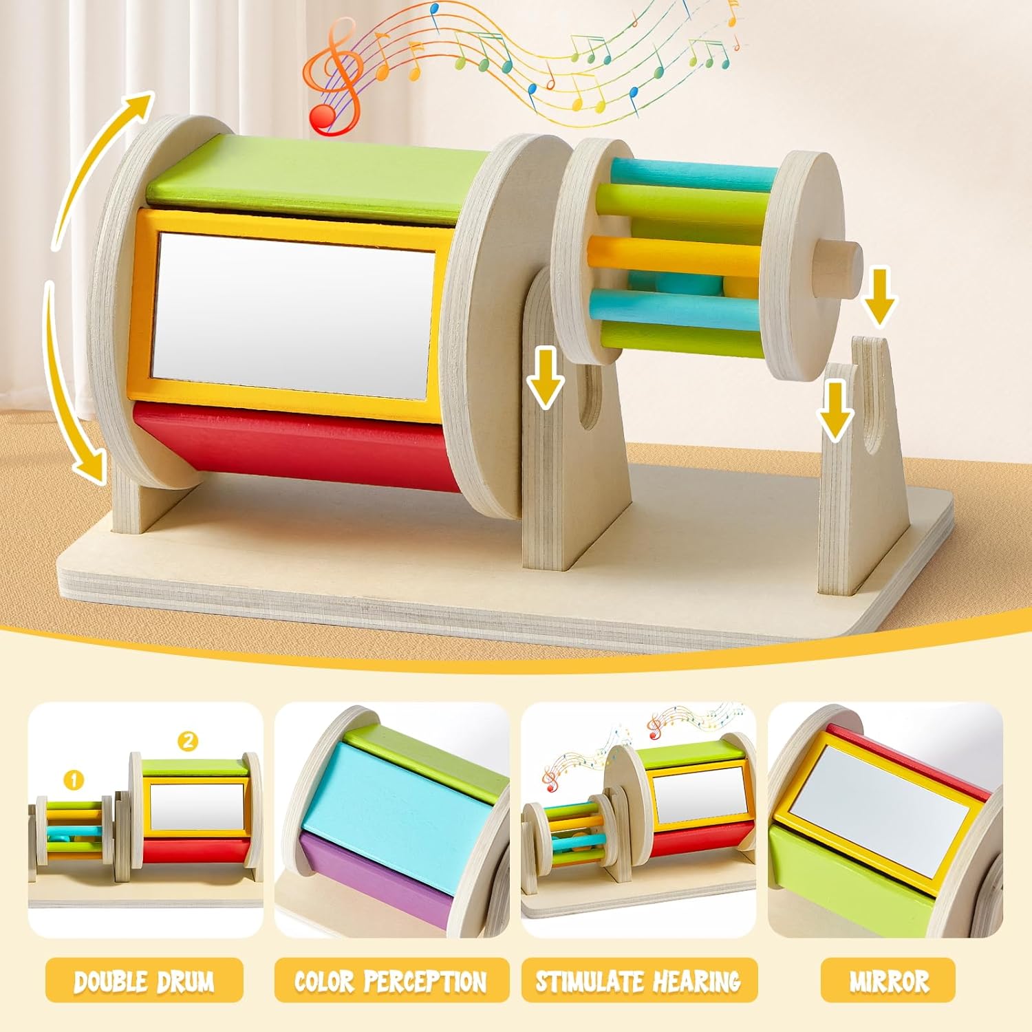 Този въртящ се барабан 2 в 1 е с дъга и огледало, както и въртяща се дрънкалка, която издава шум и привлича вниманието на вашето бебе.
