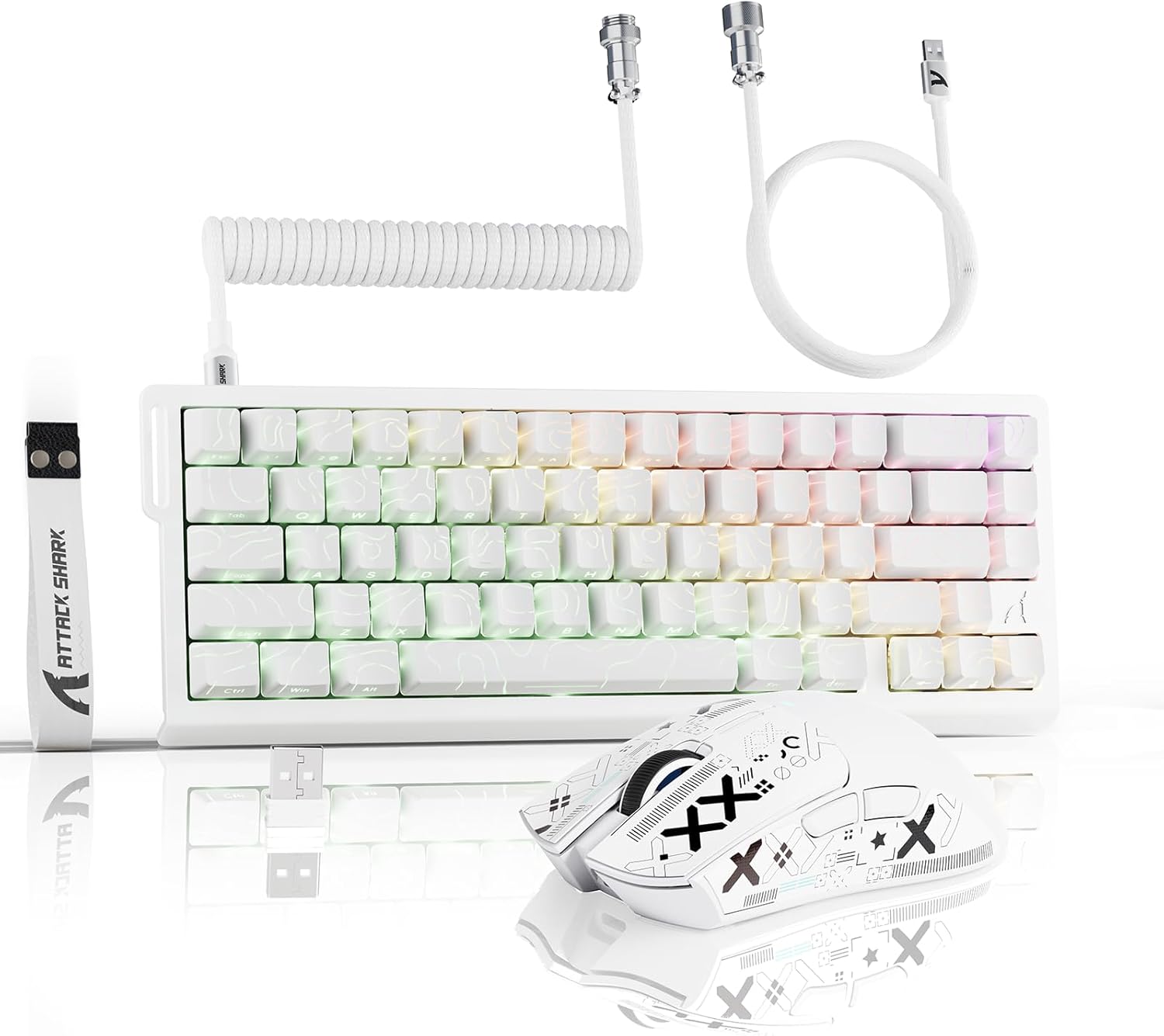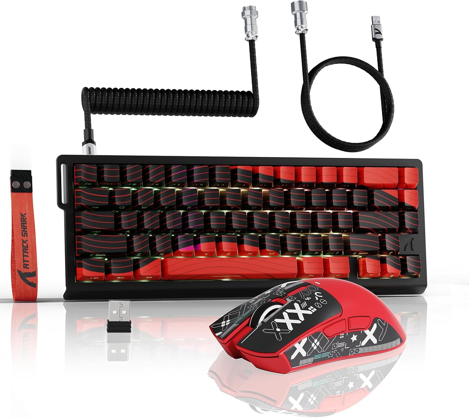 ATTACK SHARK 3-в-1 Безжична клавиатура X68PRO HE & Геймърска мишка X11 & Спирална C01PRO комбинация, BT/2.4G/Кабелна, 8KHz Магнитен превключвател с Бързо освобождаване, RGB клавиатура и мишка с черен контур