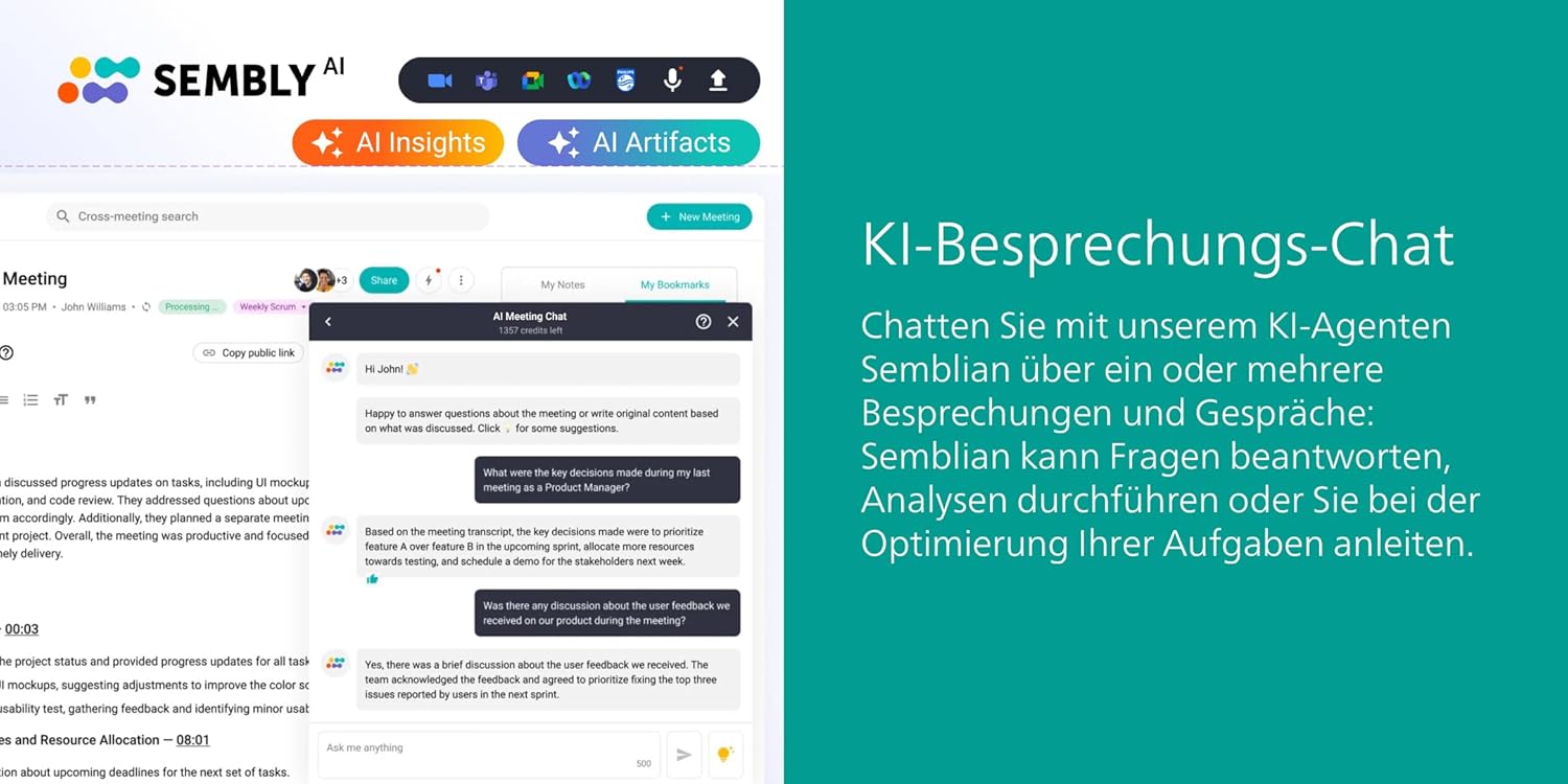 • Sembly AI автоматично открива важни задачи, решения и крайни срокове - така че нищо не се забравя. Включва чат асистент, задвижван от изкуствен интелект, за информирана информация за срещите.