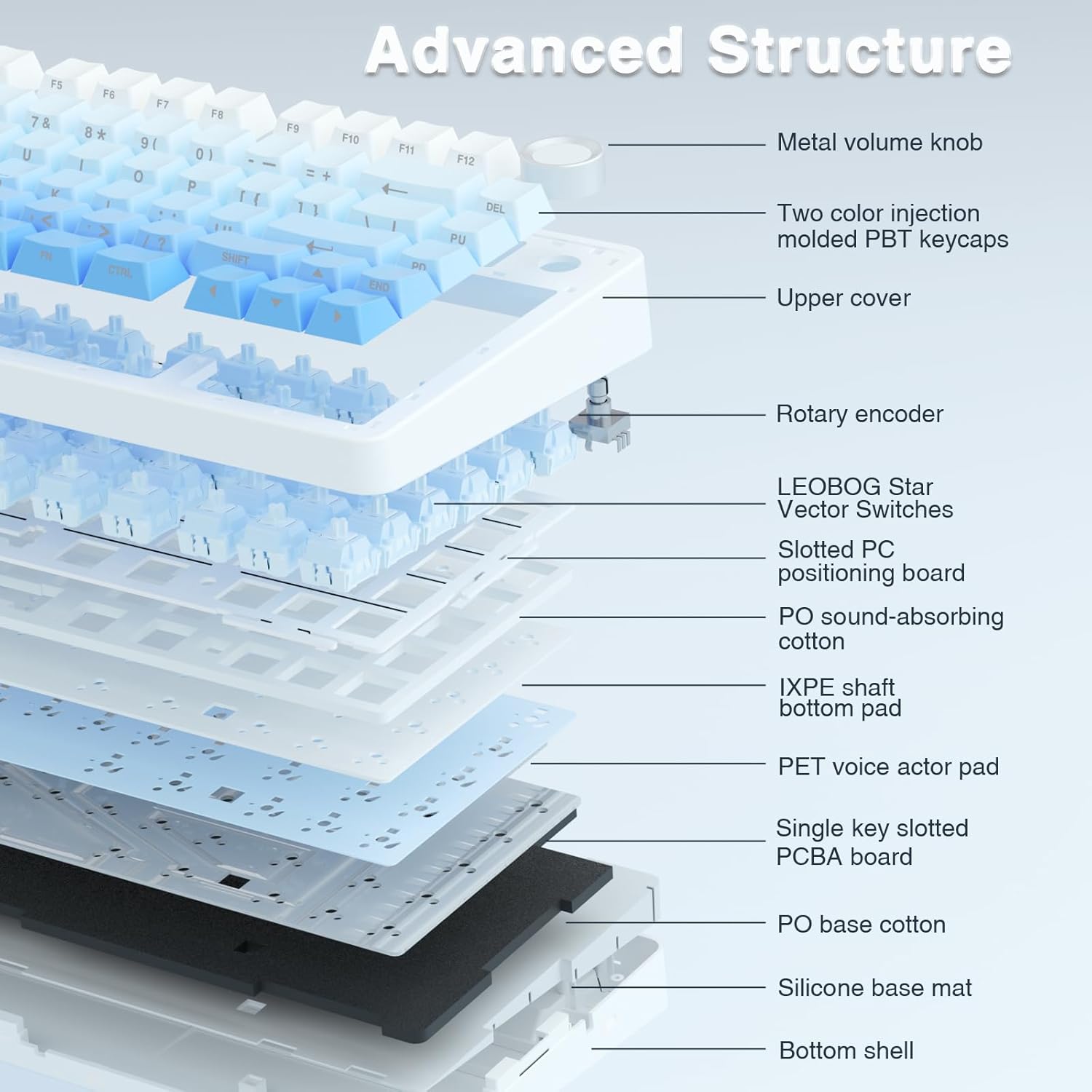 • Персонализирана клавиатура с функция за гореща замяна Тази персонализирана механична клавиатура с основа за гореща замяна поддържа замяна на 3-пинови или 5-пинови превключватели. Дори начинаещите с клавиатури могат лесно да си сглобят свои собствени клавиатури без проблеми с запояването. Геймърските клавиатури F75 Pro са оборудвани с предварително смазани стабилизатори и превключватели LEOBOG Reaper, които осигуряват плавно усещане при писане и приятен, кремообразен механичен звук и позволяват бърза реакция за вълнуващи игри.