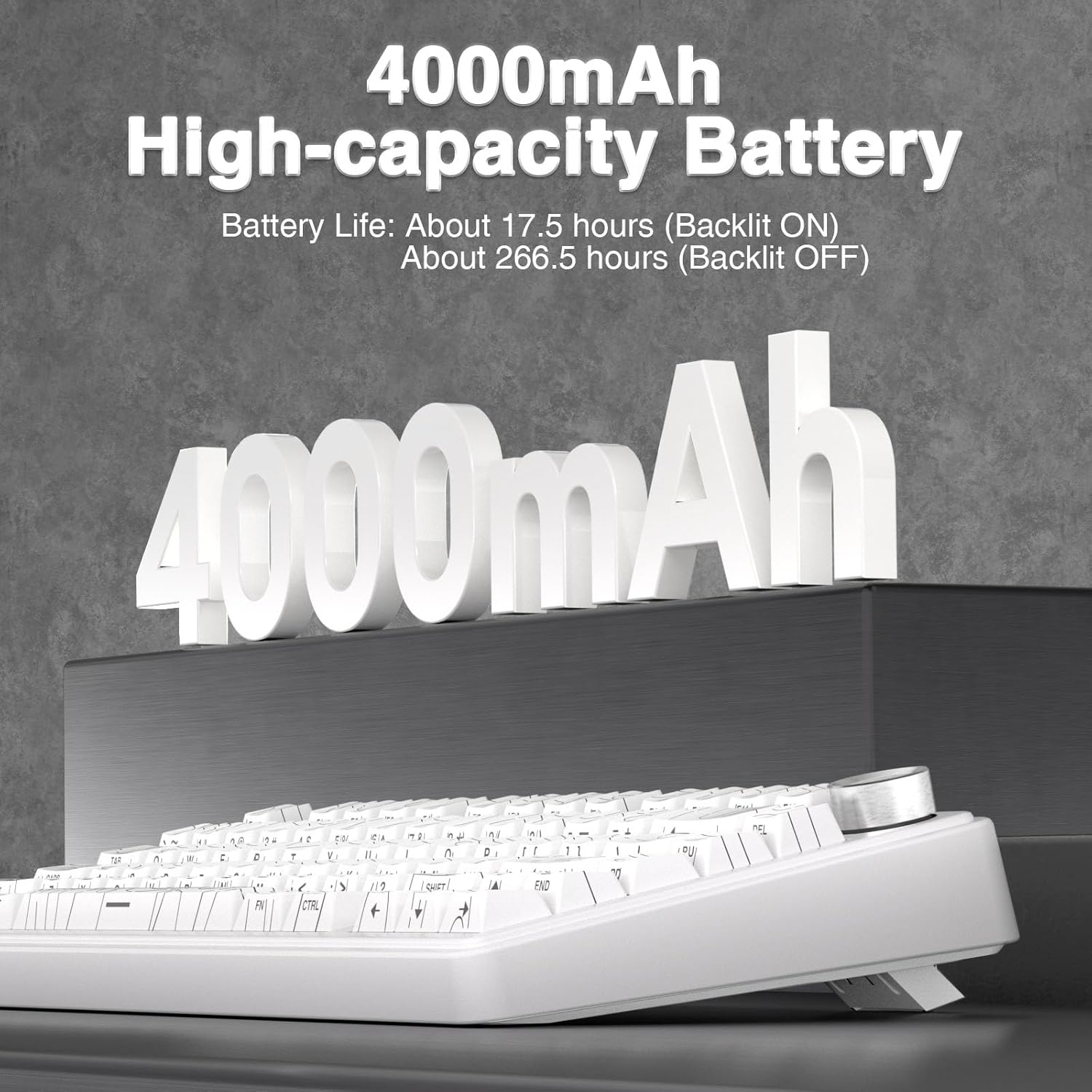 • Клавиатура с три режима на свързване: Безжичната механична клавиатура AULA F75 поддържа Bluetooth, 2.4GHz безжична и USB кабелна връзка, може да свързва до пет устройства едновременно и лесно да превключва чрез клавишни комбинации или страничен бутон. Компютърната клавиатура F75 е подходяща за компютри, лаптопи, таблети, мобилни телефони, PS, XBOX и др., за да отговори на всички нужди на потребителите. В допълнение, презареждащата се клавиатура е оборудвана с батерия от 4000 mAh с голям капацитет, която осигурява дълъг живот на батерията.